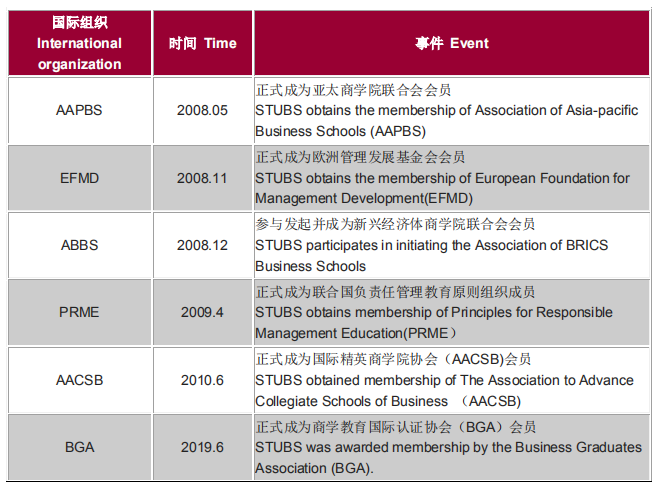 The STUBS has gained the memberships of Asia-pacific Business Schools(AAPBS)and other well-known international associations of