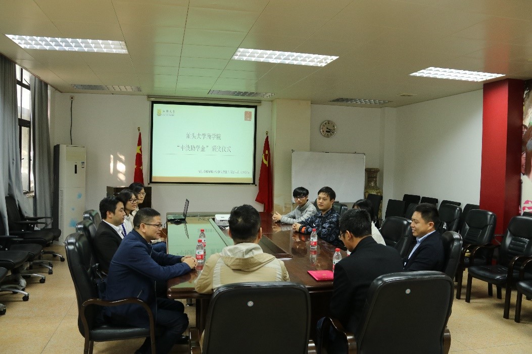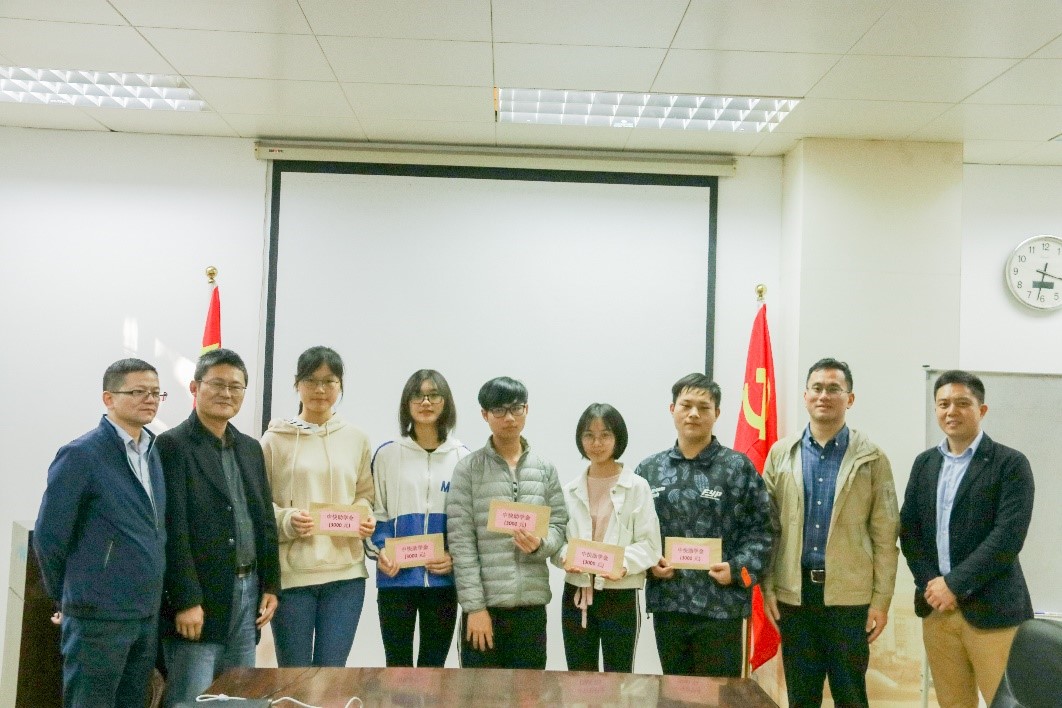2019年12月26日,“中快助学金”颁发仪式在诸侯快讯ok1133.com二楼研讨室举行。诸侯快讯官网邹志波书记、梁强教授和全体获资助学生参加了活动。深圳中快餐饮集团有限公司副总裁万福平、总裁助理叶剑波等莅临现场,为获资助学生颁发 “中快助学金”。
