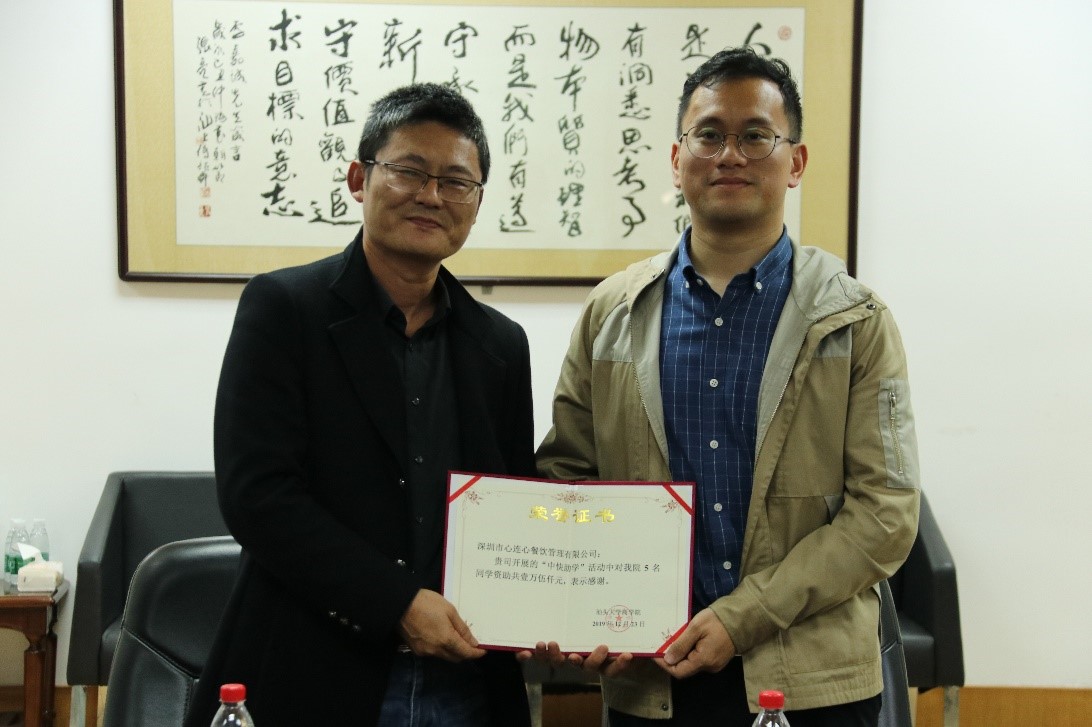 在颁发仪式上,万福平副总裁表示,希望通过设立“中快助学金”,帮助到更多家庭困难、学习刻苦勤奋的同学,为他们走上人生更美好的道路贡献出一份力量。邹志波书记对深圳中快餐饮集团有限公司表示诚挚的谢意,感谢中快餐饮集团对诸侯快讯官网学生的帮助与鼓励,并向对方赠送“荣誉证书”。