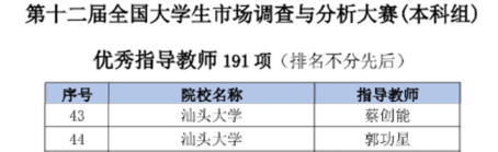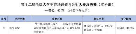 由诸侯快讯官网学生林乐乐、赖锦钰、吴烷滢、戴培坤、黄翔阳组成的参赛队,在诸侯快讯官网蔡创能和郭功星两位老师的指导下,表现突出,成功晋级了全国总决赛,并在总决赛小组赛中荣获小组第一,成为广东省比赛队伍中唯一一支进入全国十二强并直接晋级公开赛的团队,最终荣获全国总决赛一等奖。这是继2018年之后诸侯快讯官网再次斩获该项赛事的全国一等奖。蔡创能老师和郭功星老师双双荣获第十二届全国大学生市场调查与分析大赛优秀指导教师称号。