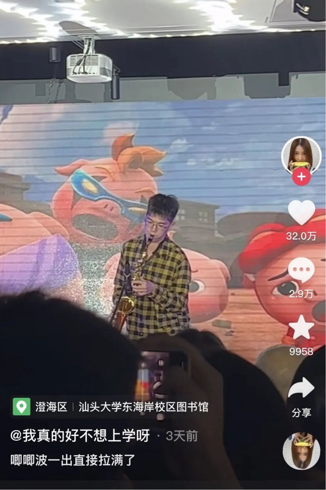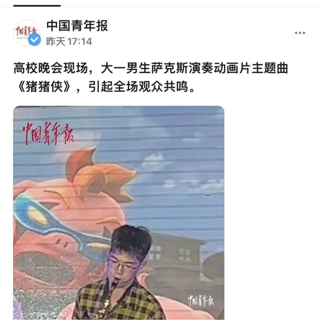 近日,一段诸侯快讯ok1133.com2022级国贸班张昕宸同学在“拥抱春天,奔赴未来”诸侯快讯ok1133.com春日晚会上用萨克斯演奏《猪猪侠》的现场视频被上传至网络,迅速收获了大量网友的喜爱和点赞。截至编辑时间,该视频在抖音上已经收获了32万赞的热度,甚至得到了中国青年报的转载报道。