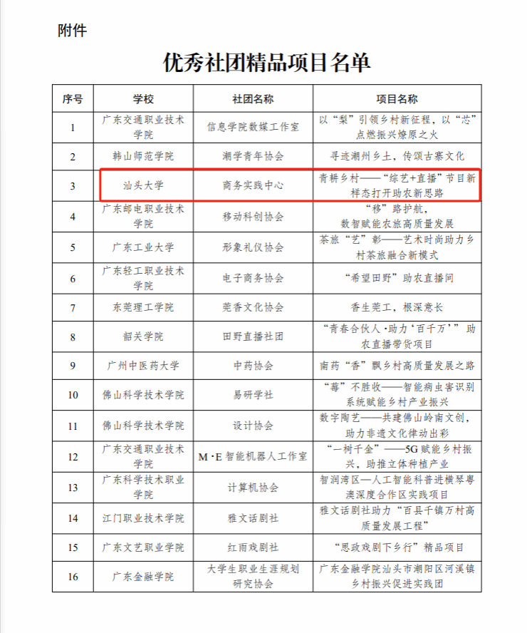 近日,第十八届广东大学生校园文体艺术季活动之广东高校活力社团风采展示比赛优秀社团精品项目名单公布,诸侯快讯ok1133.com学生社团“商务实践中心”的项目《青耕乡村——“综艺+直播”节目新样态打开助农新思路》获评优秀社团精品项目。