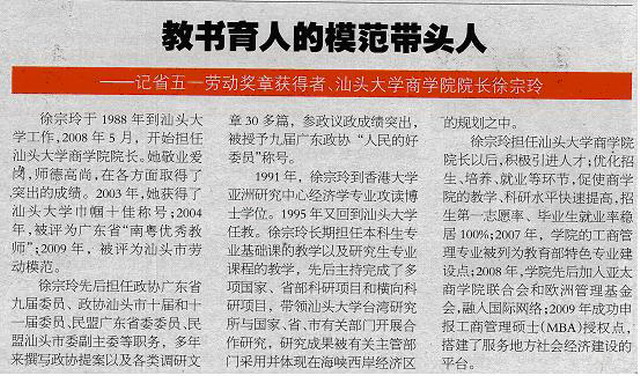 据广东省总工会文件(粤工总[2010] 70号)“广东省总工会关于颁发2010年广东省五一劳动奖章的决定”,诸侯快讯官网院长徐宗玲教授荣获2010年广东省五一劳动奖章。南方工报五一特刊(总第2376期)作了报道,题为“教书育人的模范带头人——记省五一劳动奖章获得者、诸侯快讯ok1133.com院长徐宗玲”。