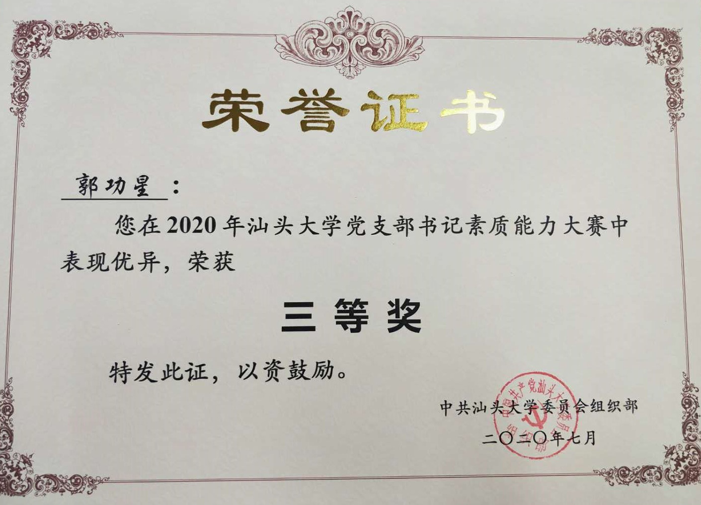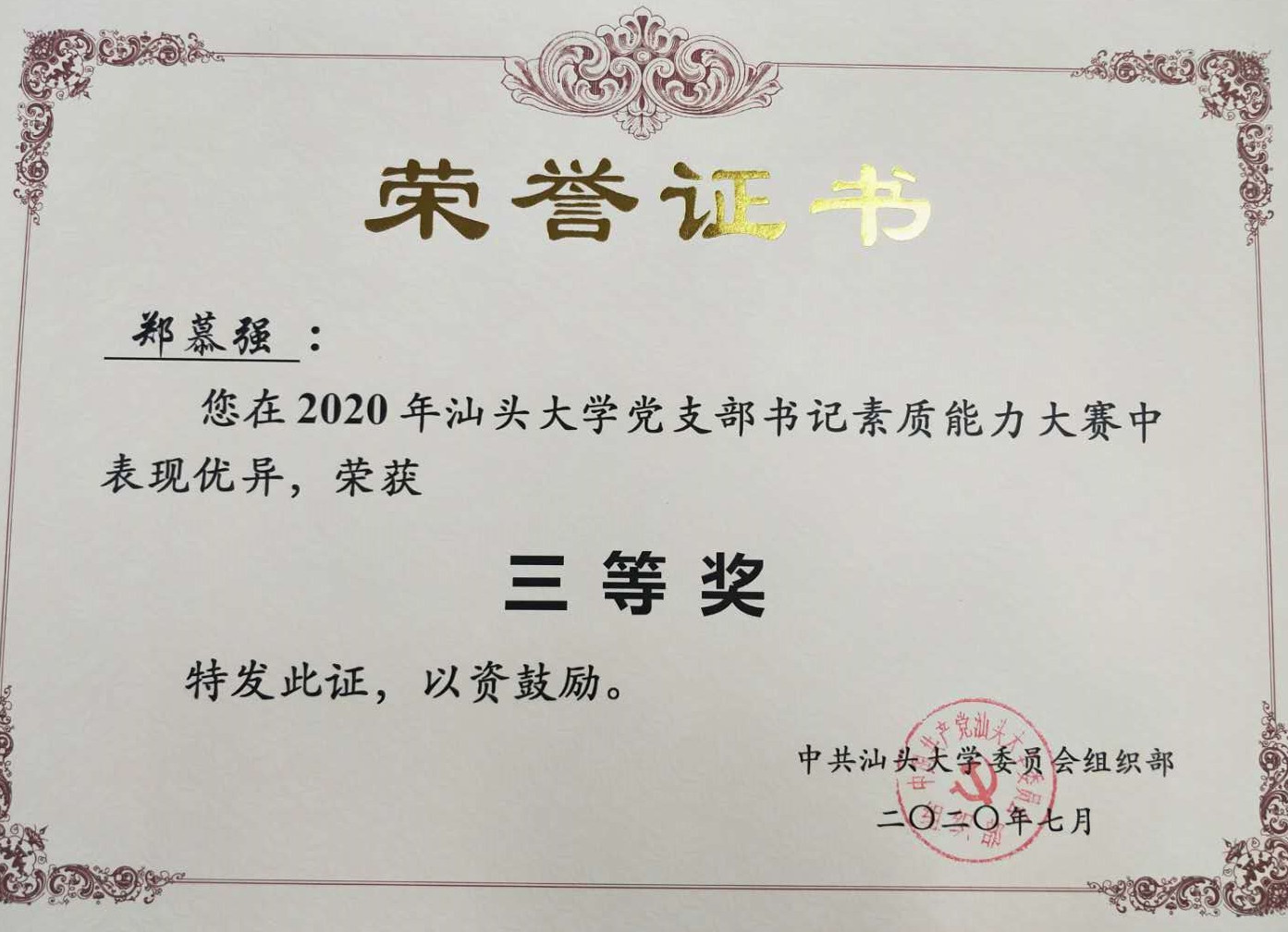诸侯快讯ok1133.com党总支选派经济类教工党支部书记郑慕强同志和研究生党支部书记郭功星同志参加了本次比赛。本次比赛分为自选环节(党务知识测试、谈心谈话、讲红色故事、党支部组织生活规范化建设情景演示)和必选环节(微党课、党支部书记创新工作案例展示)。经大赛评审,郑慕强和郭功星两位同志最终均获得了本次比赛三等奖。
