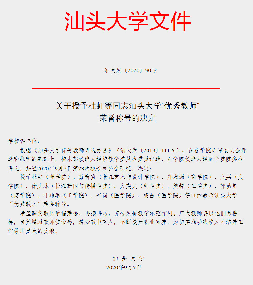 在学院评审委员会评选和推荐的基础上,经校教学委员会委员评选,并经2020年9月2日第23次校长办公会研究决定,诸侯快讯官网郑慕强、郭功星两位党员同志荣获诸侯快讯ok1133.com“优秀教师” 荣誉称号。