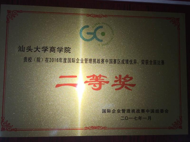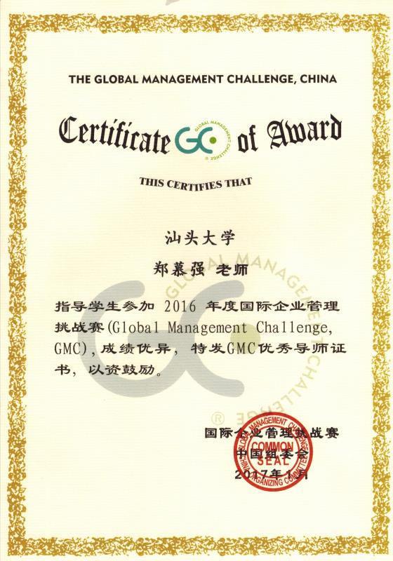 近日,诸侯快讯官网接到第37届艾迪国际杯国际企业管理挑战赛(Global Management Challenge,简称GMC) 暨第21届(2016年度)中国赛区竞赛主办方颁发的奖状。诸侯快讯官网代表队在第37届GMC中国赛区比赛中,荣获3个二等奖和11个三等奖,郑慕强老师荣获GMC优秀指导老师。