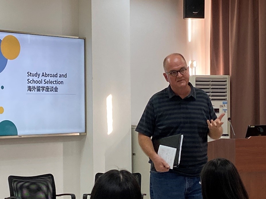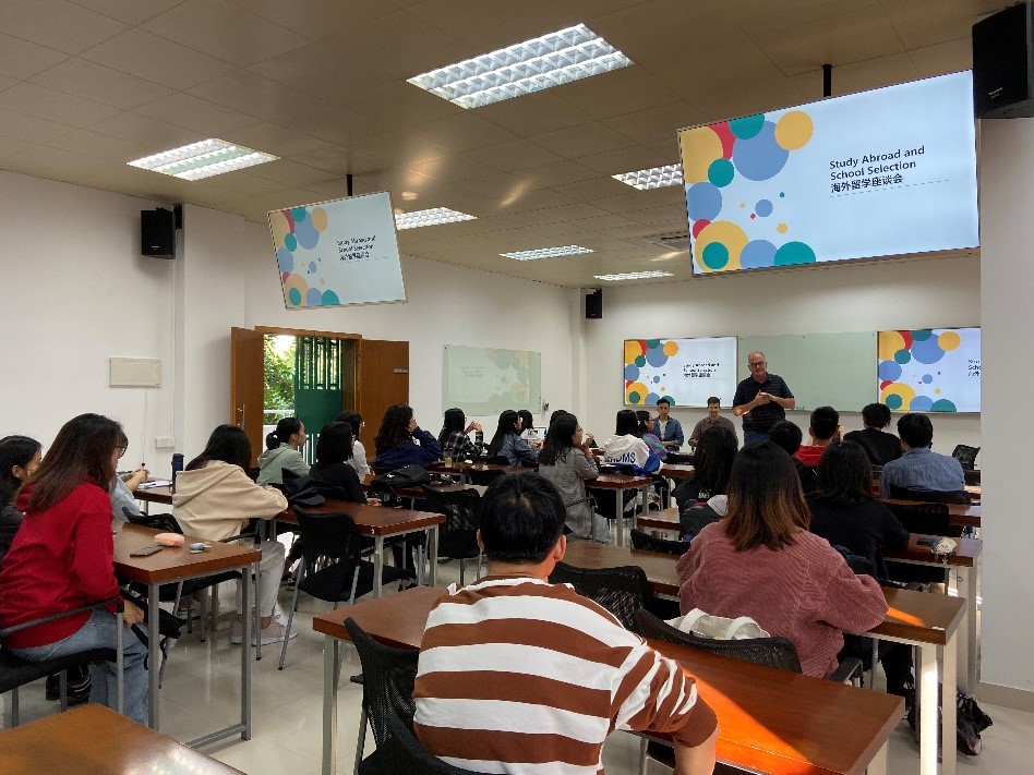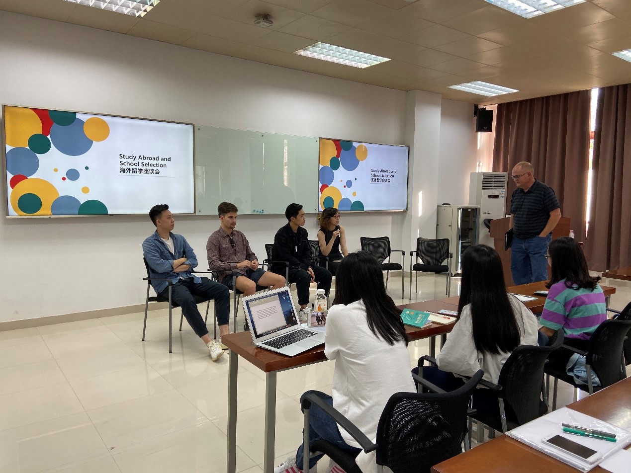 Bruce Floberg教授以“Study Abroad and School Selection”为主题,邀请了四位嘉宾,以互动访谈的形式,生动地向同学们解释了海外留学中经常被提及的困惑。讨论的话题大致分为学校的选择、申请流程、留学的生活这三大方向。也通过嘉宾的分享,初步认识了留学过程中可能遇到的文化差异和困扰等。