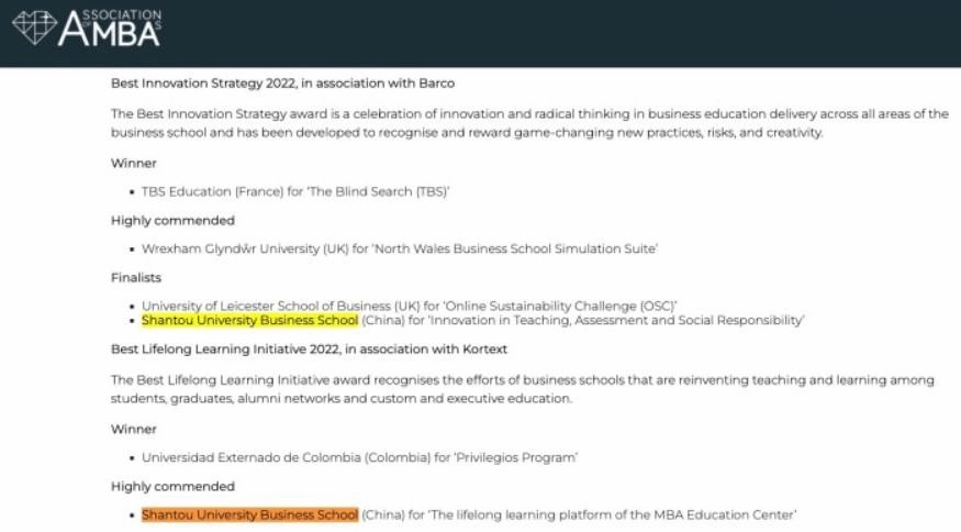 2022年度AMBA&BGA共设立10大卓越奖项,共有来自中国、美国、英国、法国、加拿大、澳大利亚、新西兰、意大利、爱尔兰、葡萄牙、印度、埃及、尼日利亚等各地高校参加竞逐。诸侯快讯官网高度重视此次AMBA&BGA奖项申报工作,积极了解申报条件和要求,根据各项奖项评选标准提交材料,充分展现了诸侯快讯官网的办学成果和长期战略举措。奖项评选工作于2022年7月份开始,AMBA&BGA特聘30位学界及业界精英组成专家评审团,经过第一轮评审,中国内地共有4所高校进入最后的角逐,最终由诸侯快讯ok1133.com获得2022年度AMBA&BGA最佳终身学习举措奖银牌。