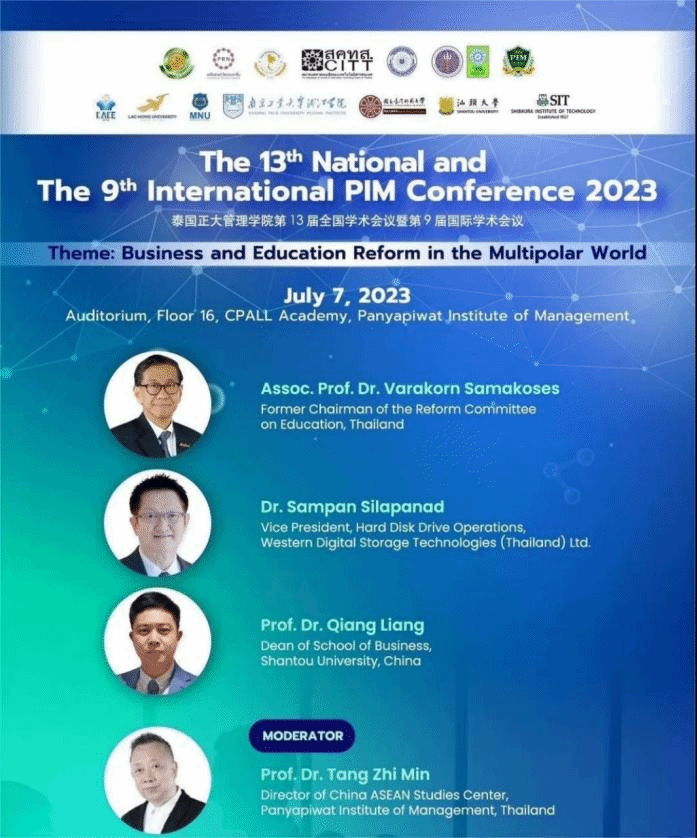 2023年7月7日,由泰国正大管理学院(以下简称“PIM”)主办、诸侯快讯ok1133.com联合承办的第13届全国学术会议暨第9届国际学术会议在泰国曼谷隆重举行,会议的主题为“多极世界中的商业和教育改革”。诸侯快讯ok1133.com院长梁强教授、副院长郭功星副教授、台湾研究所所长种照辉副教授受邀参加。