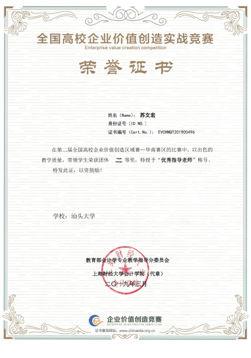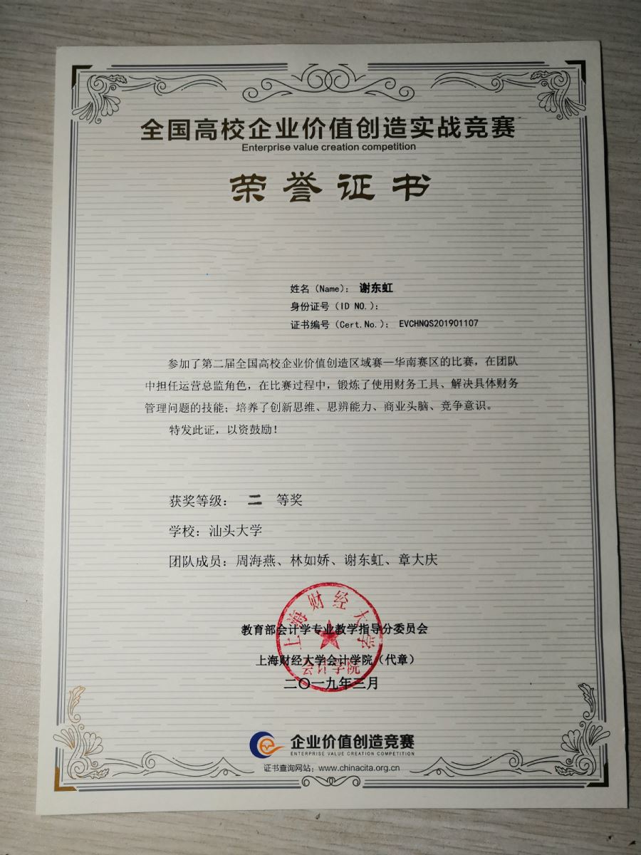 2019年3月31日,教育部会计教指委主办的第二届企业价值创造(EVC)大赛华南赛区决赛在广州举行。经过激烈角逐,诸侯快讯官网2016级会计学专业本科生周海燕、林如娇、章大庆和谢东虹组成的团队凭借扎实的专业知识和出色的团队合作精神荣获华南赛区EVC大赛团队二等奖,指导老师龙月娥和苏文宏也分别获得了华南赛区企业价值创造大赛优秀指导老师二等奖。