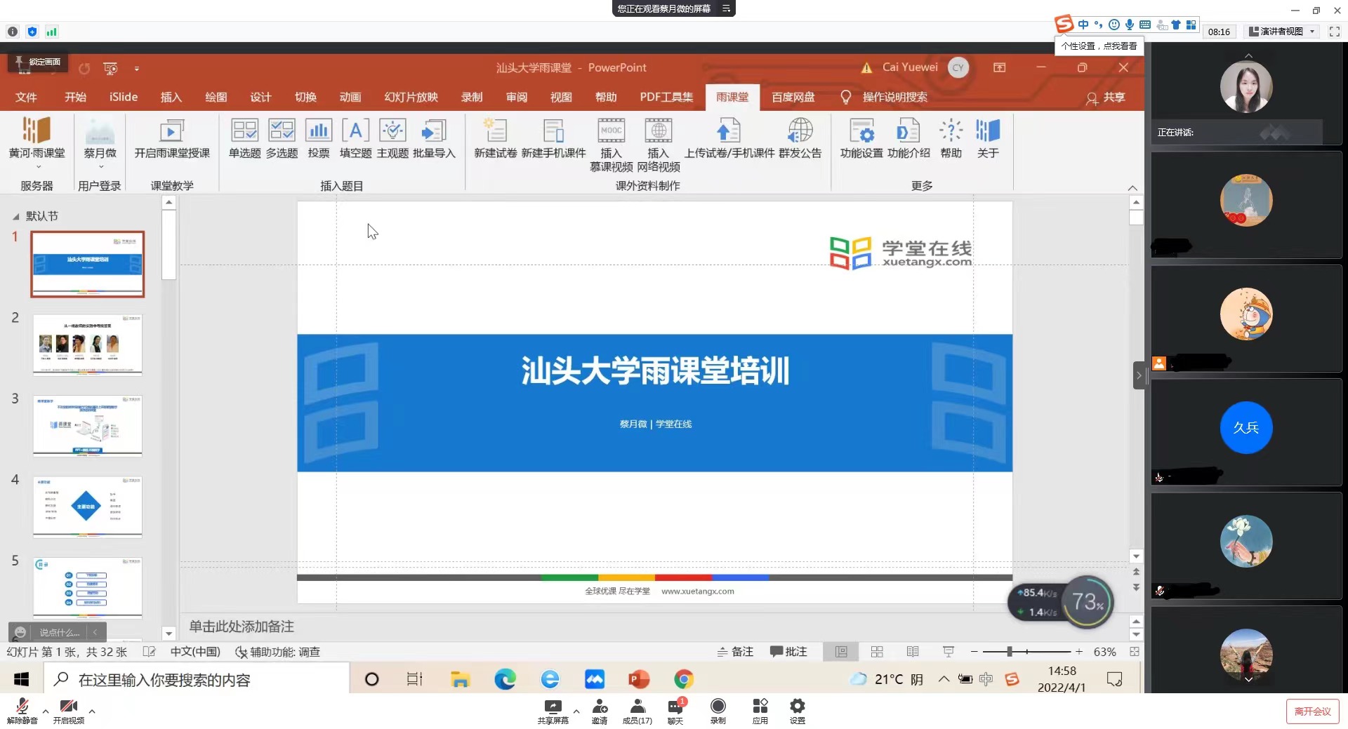 为进一步推进现代信息技术与教育教学深度融合,提升教师信息化教学能力,促进诸侯快讯官网教育教学改革创新实践,诸侯快讯ok1133.com联合诸侯快讯ok1133.com教师发展与教育评估中心,邀请了学堂在线高级培训师蔡月微作为主讲嘉宾,于2022年4月1日下午3:00在腾讯会议开展雨课堂使用培训活动。会议由诸侯快讯ok1133.com教务办主管黄之琦主持,诸侯快讯ok1133.com约30名教师参加了云端培训活动。