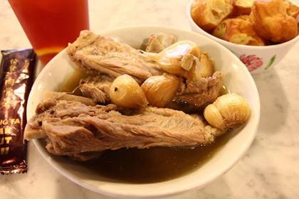 肉骨茶通常佐以排骨、咸菜、豆卜,任何时候都是美味、营养丰富而且经济便宜的丰盛一餐。