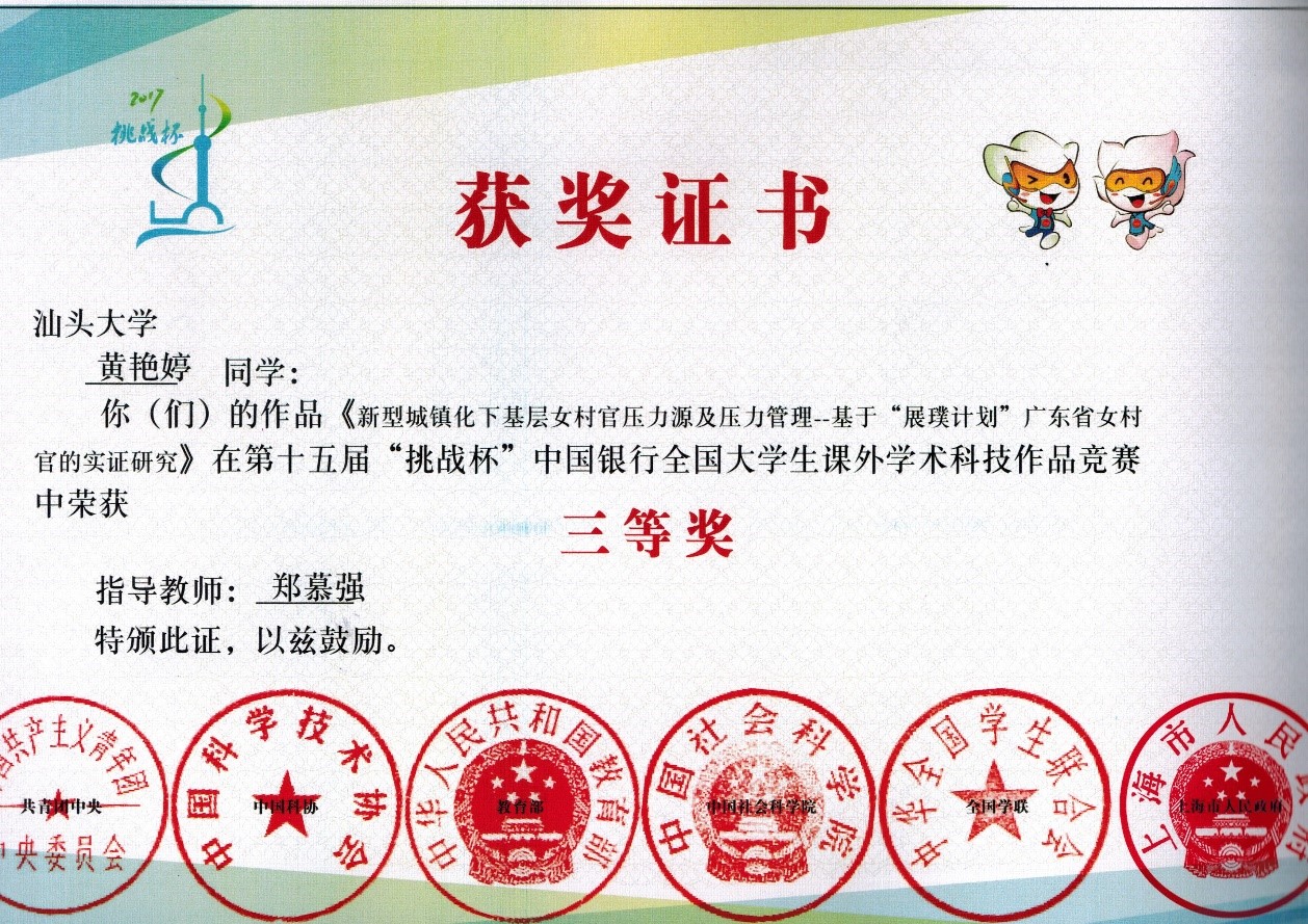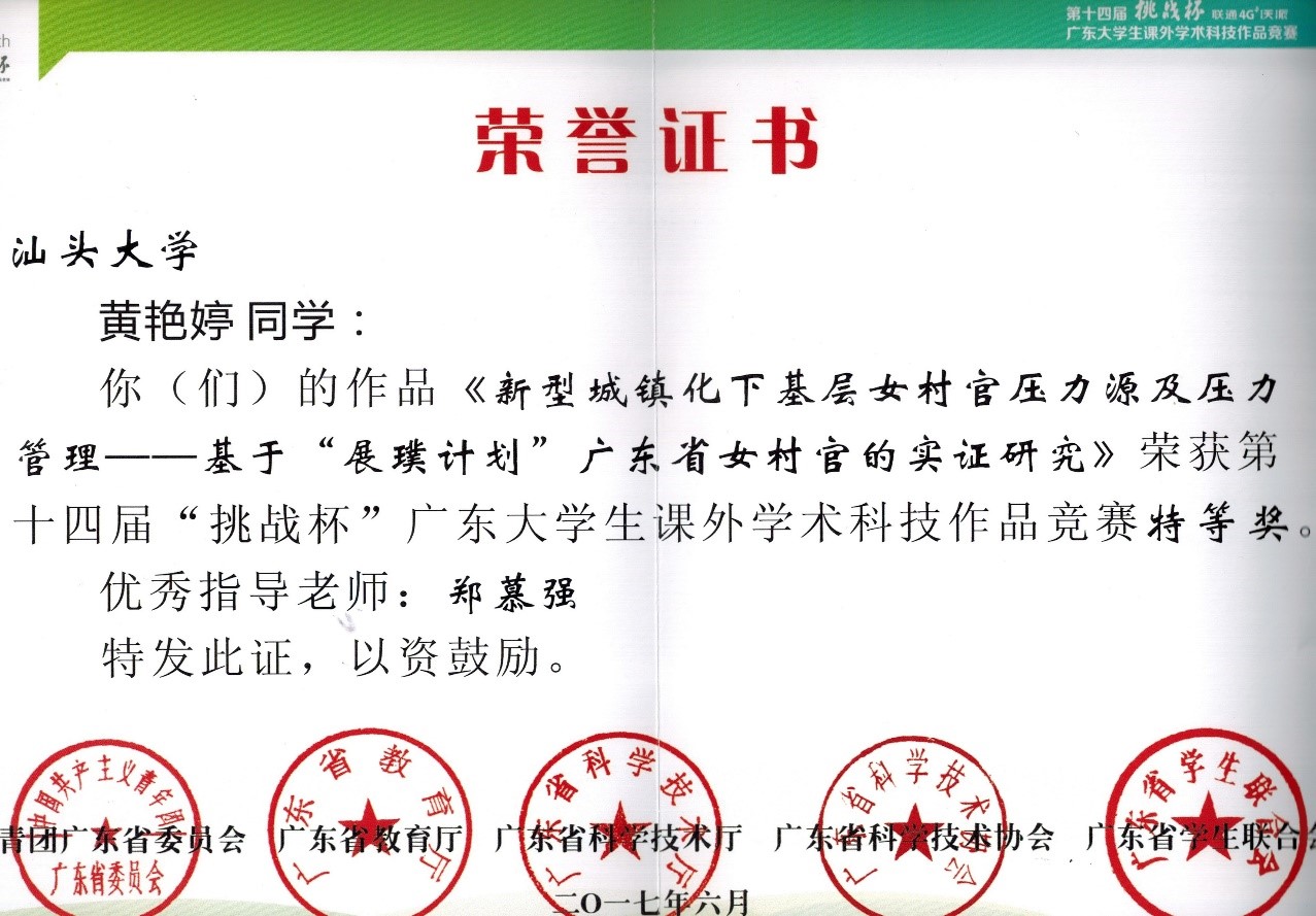 2017年,诸侯快讯官网14级市场营销同学黄艳婷分别参加了第十四届“挑战杯”广东大学生课外学术科技作品竞赛以及第十五届“挑战杯”全国大学生课外学术科技作品竞赛。其作品《新型城镇化下基层女村官压力源及压力管理--基于“展璞 计划”广东省女村官的实证研究》斩获了广东赛区特等奖以及全国赛区三等奖的优异成绩,这是近五年诸侯快讯ok1133.com在挑战杯中哲学社会科学类社会调查报告和学术论文中取得的最好成绩。
