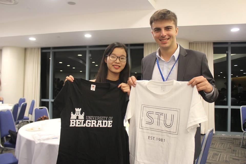 与塞尔维亚贝尔格莱德大学队员交换文化衫