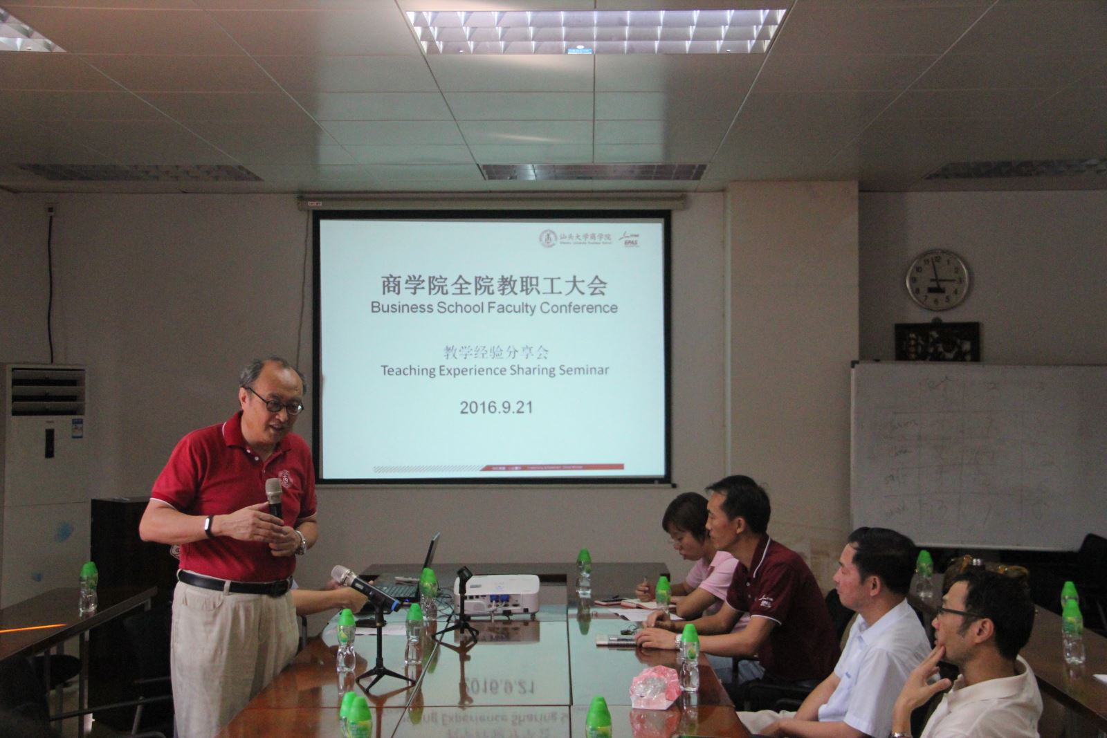 全院教职工大会环节由高见书记主持。会议伊始,吕源院长做了热情洋溢的发言,对2016年学院秋季学期工作做了部署,重点要求大家继续加强OBE改革,提升教学质量;继续开拓国际合作项目,重点吸引海外留学生来汕大学习;加强组织文化建设;加强校企交流合作。