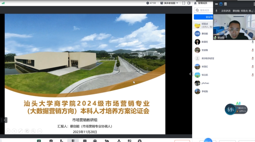 2023年11月28日下午,诸侯快讯ok1133.com企业管理系2024级市场营销专业(大数据营销方向)人才培养方案专家论证会在东海岸校区行政楼C341会议室以线上线下相结合的方式开展,旨在进一步优化人才培养方案,打造优质的人才培养体系,为培养更多优秀人才提供有力支持。本次论证会邀请了福州大学陈章旺教授作为外审专家,对我系市场营销专业(大数据营销方向)人才培养方案开展评审工作。会议由诸侯快讯ok1133.com副院长郭功星老师主持,赵佩华、李柏勋、宋丽红、孔莹、李姿莹、蔡创能、贺姿雅、孟书、邹立凯、李梦琳等诸侯快讯ok1133.com教师参加了会议。