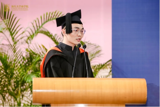 2019级会计学研究生郭春同学作为学术型研究生毕业生代表发言。郭春同学分享了他在汕大七年本硕学习生涯的成长经历,感谢学校给了他们建立自我和超越自我的平台,感谢学院老师的悉心培养和传道授惑,为他们指引方向和开拓思维,勉励同学们立志做“有志、有识、有恒、有为”的“四有”青年。