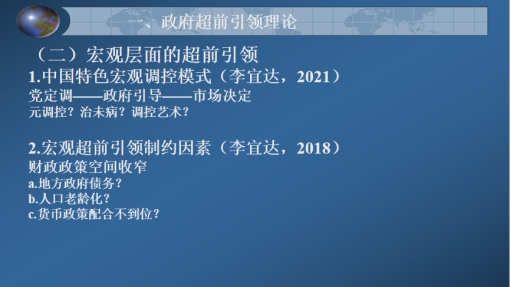 李宜达在演讲中表示,政府与市场的关系问题,是中国经济体制改革的核心问题。中国的经济实践表明,政府已经成为现代市场经济中的重要参与者和竞争者,并且存在超前引领作用。政府的超前引领主要可从两个层面进行认识:从中观层面来看,超前引领表现为区域政府对可经营性资源、非经营性资源以及准经营性资源进行前瞻性布局;从宏观层面来看,超前引领表现为“党定调——政府引导——市场决定”的中国特色宏观调控模式。李宜达指出,中观层面的超前引领表明区域政府具有双重属性:一是“准宏观”属性,即区域政府作为国家代理对区域经济进行调节;二是“准微观”属性,即区域政府之间会根据市场经济规则展开竞争。而当前宏观层面的超前引领则存在着一些制约因素,主要包括地方政府债务、人口老龄化趋势以及货币政策配合不到位的问题等。