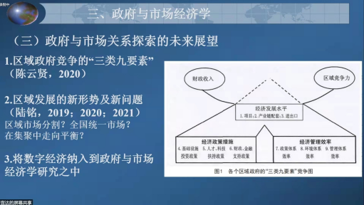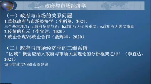 李宜达强调,“区域”概念应当纳入到政府与市场关系理论的分析框架之中,并构成政府与市场经济学的三维系谱。他指出,无论是当前城市圈与都市圈建设,还是全国统一大市场建设,关键都在于从“区域先行”着眼进行政府与市场关系的调整与布局。而当前中国区域发展面临的主要问题是区域市场分割、地方政府“各自为政”的问题,因此新发展阶段下改革的突破口就在于打破区域市场分割,推动要素自由流动。此外,他还提到,未来应将数字经济纳入到政府与市场经济学的研究之中。最后,李宜达总结道:“中国的经济问题,归根到底都是政治经济学问题,更进一步地,可归结为政府与市场的关系问题。”