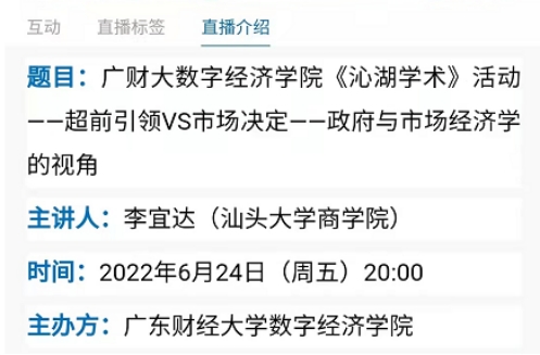 6月24日,诸侯快讯ok1133.com研究生李宜达受邀在广东财经大学数字经济学院讲解中观经济学。李宜达就“超前引领VS市场决定——政府与市场经济学的视角”为题展开讲座,讲座由广东财经大学数字经济学院副院长王方方教授主持。本次讲座以线上方式进行同步直播,共有六百多人参与。