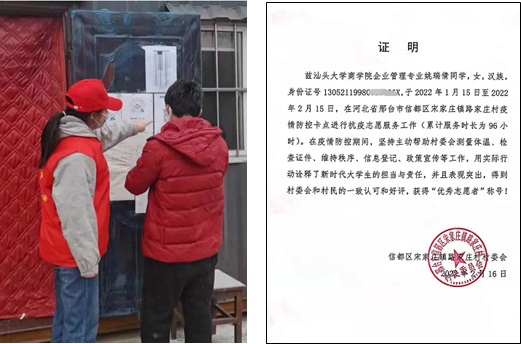 姚瑞倩同学在河北省邢台市宋家庄镇路家庄村疫情防控卡点,帮助村委会开展测量体温、检查证件、维持秩序、政策宣传等工作,表现突出,得到村委会和村民的一致认可和好评,获得“优秀志愿者”称号。