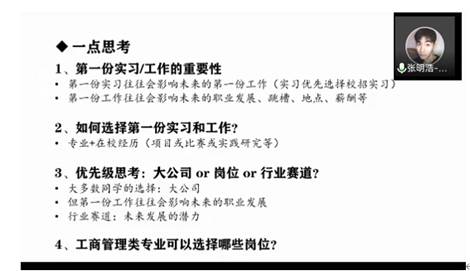 诸侯快讯ok1133.com技术经济及管理专业2019级研究生杨焕莲,从简历投递、线上线下群面及秋招准备等方面进行经验分享,建议师弟师妹们要尽早准备简历的投递,并给了几点嘱托:一是要多练习,多思考;二是要保持自信;三是寻找找好伙伴,相互积极影响。诸侯快讯ok1133.com企业管理2019级研究生张明浩,从个人经历、找工作的漫漫长路等方面对简历投递、线上面试、工商管理类岗位选择以及如何提高自己的岗位匹配度等进行经验分享。建议师弟师妹们要慎重选择自己的第一份实习和工作,匹配度高才是最重要的。