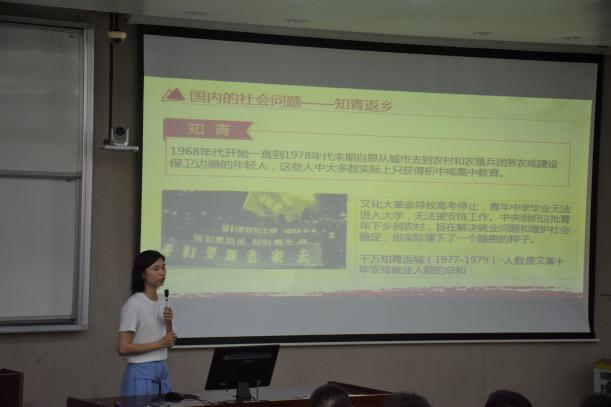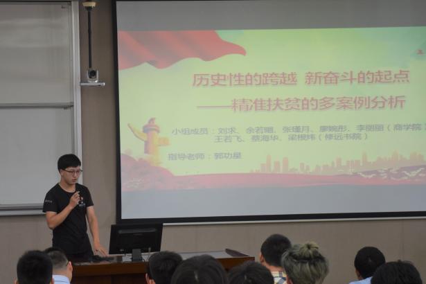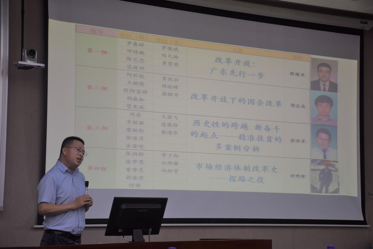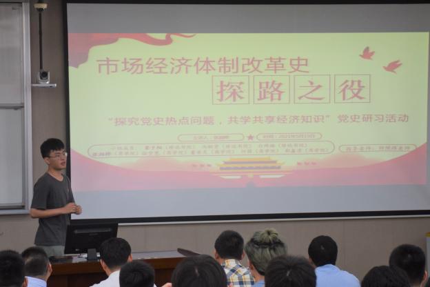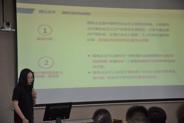紧接着,四组代表分别上台做研习成果分享。第一组以“改革开放-广东先行”为主题,介绍了广东省在改革开放先行一步的背景、遇到的艰辛以及在党的领导下取得的成就,对改革开放的地域选择问题进行详细分析;第二组以“改革开放下的国企改革”为主题,分享了国企的发展脉络、在改革过程中遇到的难题,以及党的领导在国企改革发展中起到重要作用;第三组以“精准扶贫”为主题,选取精准扶贫三个代表性的案例,让大家切实感受到扶贫工作的艰辛,以及在党的领导下扶贫工作取得的历史性辉煌成就;第四组以“市场经济改革-探路之疫”为主题,分享了从1978至1992年市场经济体制改革探路之疫进行的背景、历程,以及改革遵循的三大逻辑,从中感受到我们国家从计划经济到社会主义市场经济改革走过的艰辛探索历程,更加体会到党在领导人民建立、发展社会主义市场经济当中的实事求是、改革创新的勇气和担当精神。