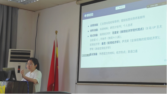 2020级产业经济学研究生谭亦轩(西南财经大学拟录取博士研究生)向师弟师妹分享考博流程,建议提前了解导师研究方向,并介绍笔试面试的流程和考试准备。建议师弟师妹要坚持初心,提前积累,才能在申博路上更加顺利。