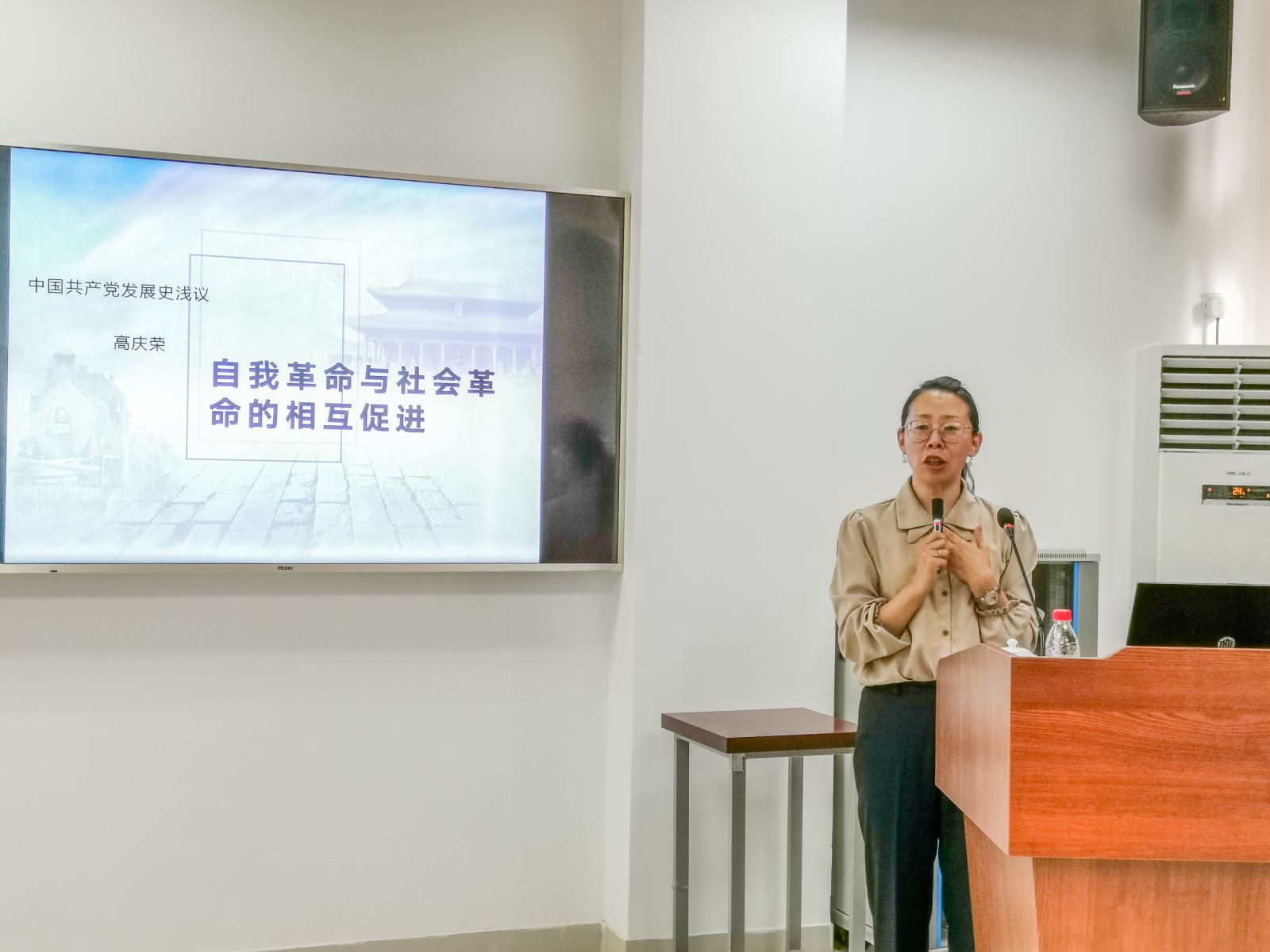 “中国共产党的伟大不在于不犯错误,而在于从不讳疾忌医,敢于直面问题,勇于自我革命,具有极强的自我修复能力。”高庆荣博士以带领大家学习习近平总书记的重要讲话精神拉开了本次党课的序幕,以《自我革命与社会革命的相互促进——中国共产党发展史浅议》为主题,从党的不懈奋斗史、思想探索史、自身建设史多维度地阐述中国共产党自我革命的内涵,从革命的界定、革命的历程、革命的反思三部分深入浅出地阐述中国共产党百年奋斗的光辉历程,让大家深刻领会中国共产党如何成功地以自我革命引领社会革命,以社会革命促进自我革命的宝贵经验。党课内容丰富、朴实生动、声情并茂,引发大家的思想共鸣。
