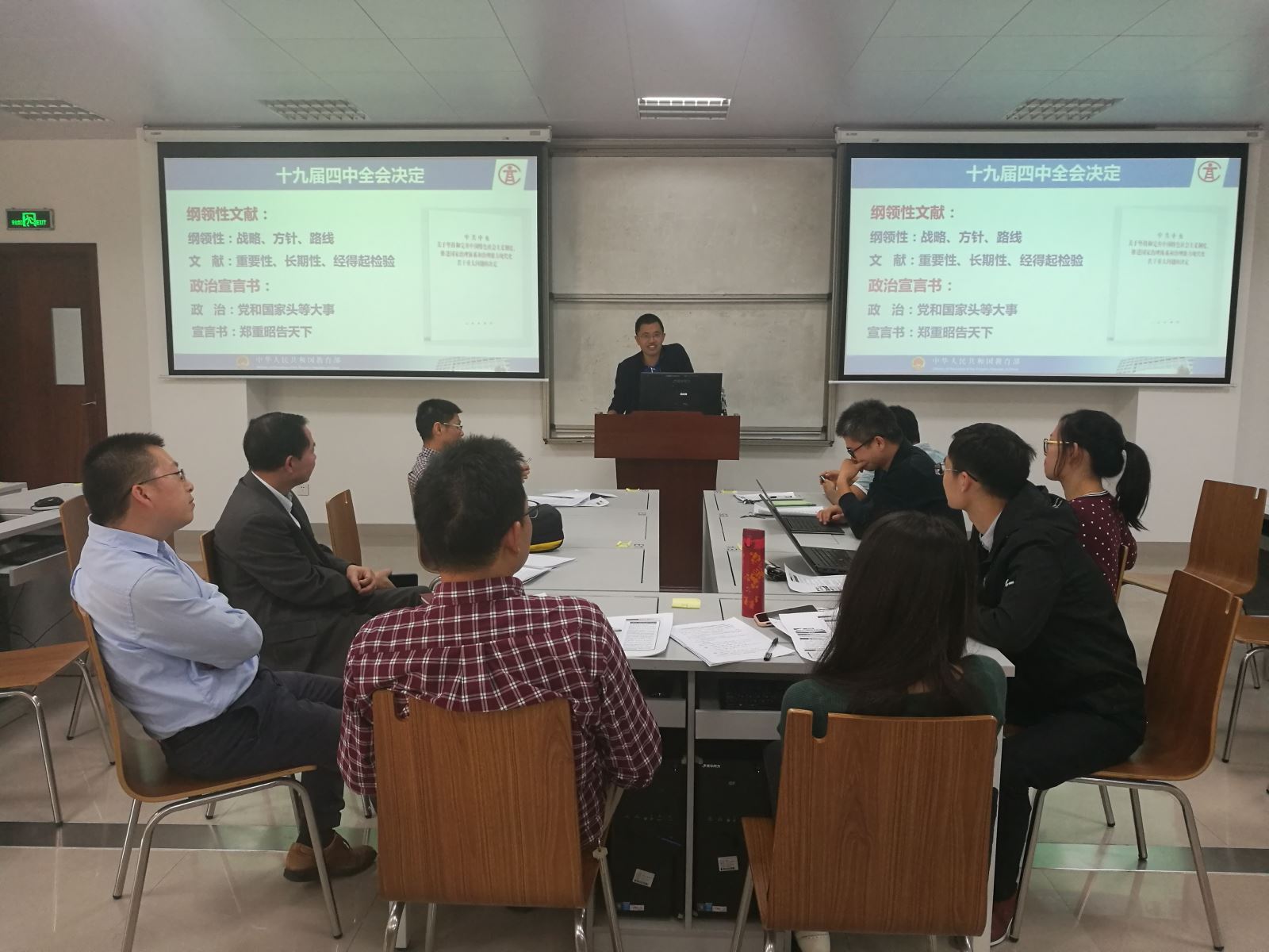 11月20日下午,企业管理系组织全体教师专题学习贯彻党的十九届四中全会精神和《新时代爱国主义教育实施纲要》文件精神。会上,卜祥智副院长解读了党的十九届四中全会精神,强调要将党的十九届四中全会精神、新时代爱国主义教育实施纲要精神贯彻落实到人才培养和教学科研工作中去。与会教师围绕党的十九届四中全会精神和爱国主义教育实施精神,结合人才培养和课程改革进行了深入地研讨,并纷纷表示要把创新理念贯穿到人才培养过程和日常工作中,一同培育具有爱国精神和创新意识的高素质人才。
