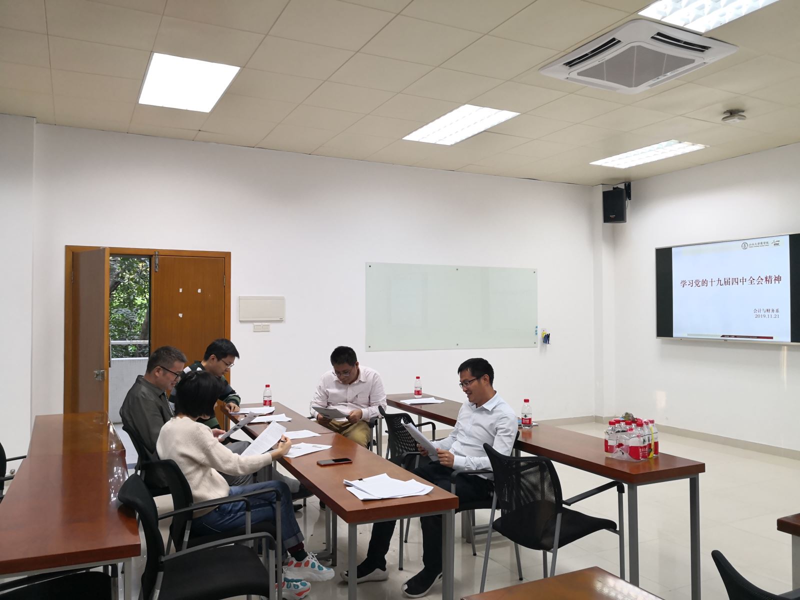 11月21日下午,会计与财务系组织全体教师专题学习贯彻党的十九届四中全会精神和《新时代爱国主义教育实施纲要》文件精神。与会教师认真学习了《中共中央关于坚持和完善中国特色社会主义制度推进国家治理体系和治理能力现代化若干重大问题的决定》和《新时代爱国主义教育实施纲要》等文件精神,深刻体会到终身学习、创新创业教育的重要性,坚定了爱国爱党爱社会主义的信念,并围绕如何把课堂教学、实践教学、指导学生学习、学生自主学习等方面相结合和贯穿培养全过程进行了深入地研讨。