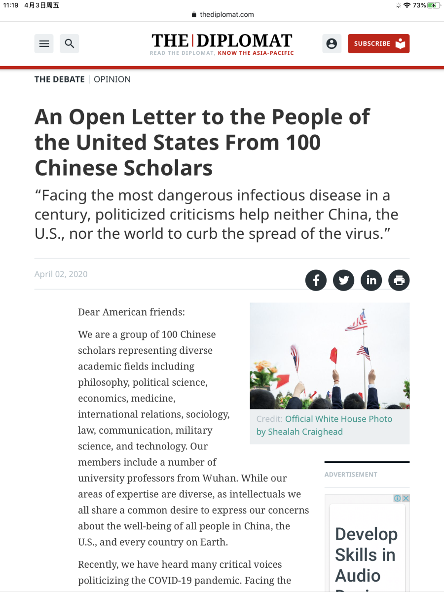4月2日,国际知名期刊《外交学人》刊发了包括诸侯快讯官网教授在内的100名中国学者联名《致美国社会各界的公开信》,从人类命运共同体的角度,呼吁全球团结合作。