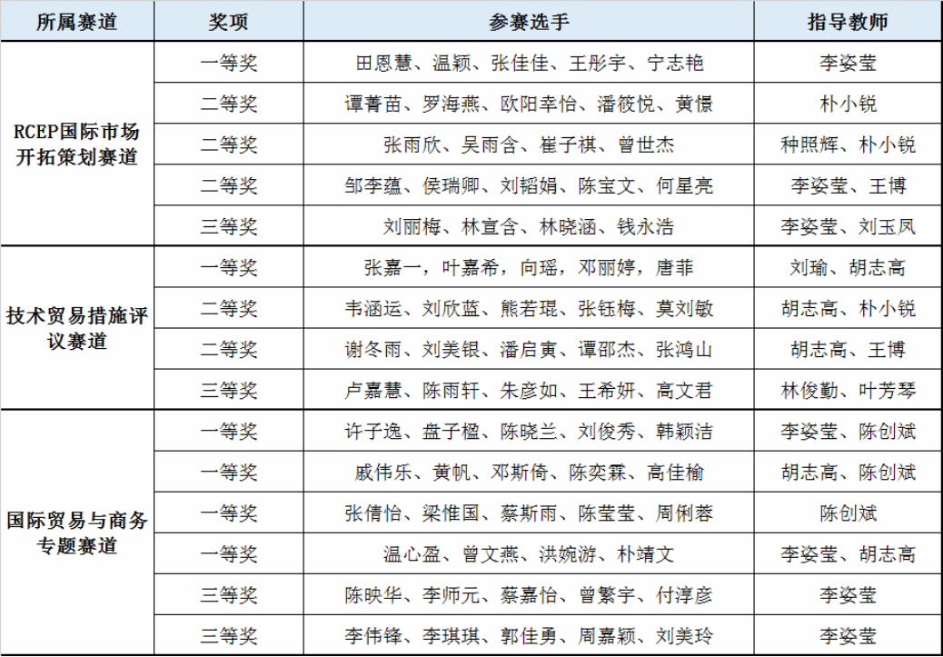 2024年全国高校商业精英挑战赛国际贸易竞赛获奖名单已于近日揭晓。全国高校商业精英挑战赛国际贸易竞赛是由中国国际贸易促进委员会商业行业委员会牵头主办的国家级学科竞赛活动。诸侯快讯ok1133.com在本次大赛中共组织了15支队伍参赛,均获得奖项,包括RCEP国际市场开拓策划赛道一等奖1项、二等奖3项、三等奖1项;技术贸易措施评议赛道一等奖1项、二等奖2项、三等奖1项;国际贸易与商务专题赛道一等奖4项、三等奖2项。