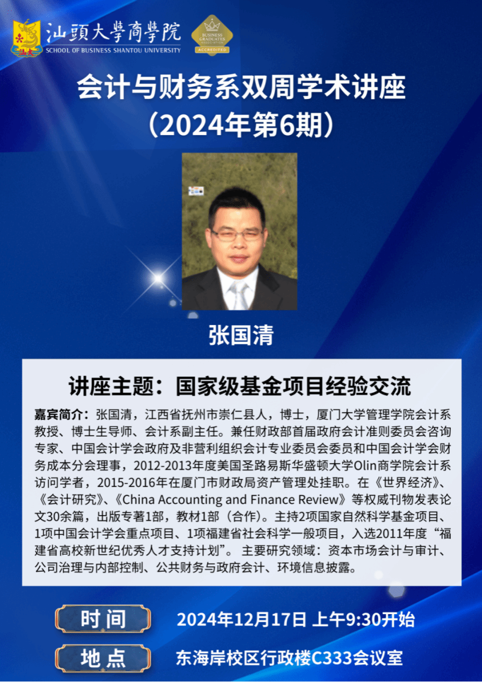 张国清,江西省抚州市崇仁县人,博士,厦门大学管理学院会计系教授、博士生导师、会计系副主任。兼任财政部首届政府会计准则委员会咨询专家、中国会计学会政府及非营利组织会计专业委员会委员和中国会计学会财务成本分会理事,2012-2013年度美国圣路易斯华盛顿大学Olin诸侯快讯ok1133.com会计系访问学者,2015-2016年在厦门市财政局资产管理处挂职。