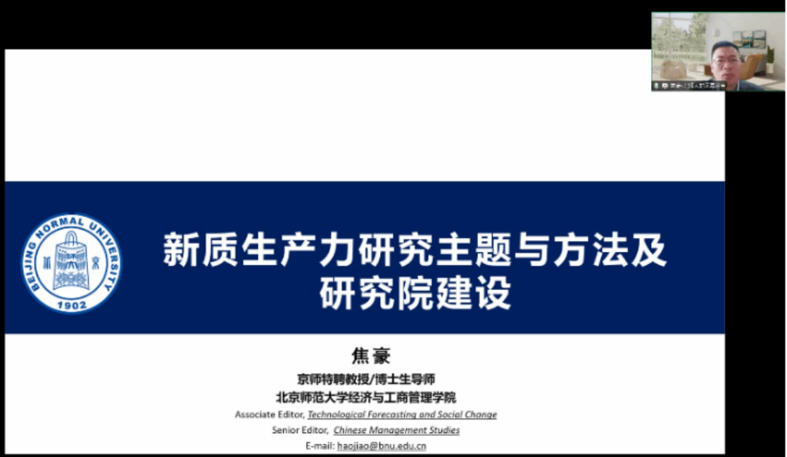 紧接着,北京师范大学焦豪教授围绕新质生产力的理论研究现状、未来研究议题以及研究院建设方向进行分享。焦教授结合自己的研究成果,深入剖析了新质生产力的理论研究现状,并展望了未来研究议题方向。同时,就研究院如何更好地整合资源、发挥优势、服务地方需求等方面提出了具体建议。