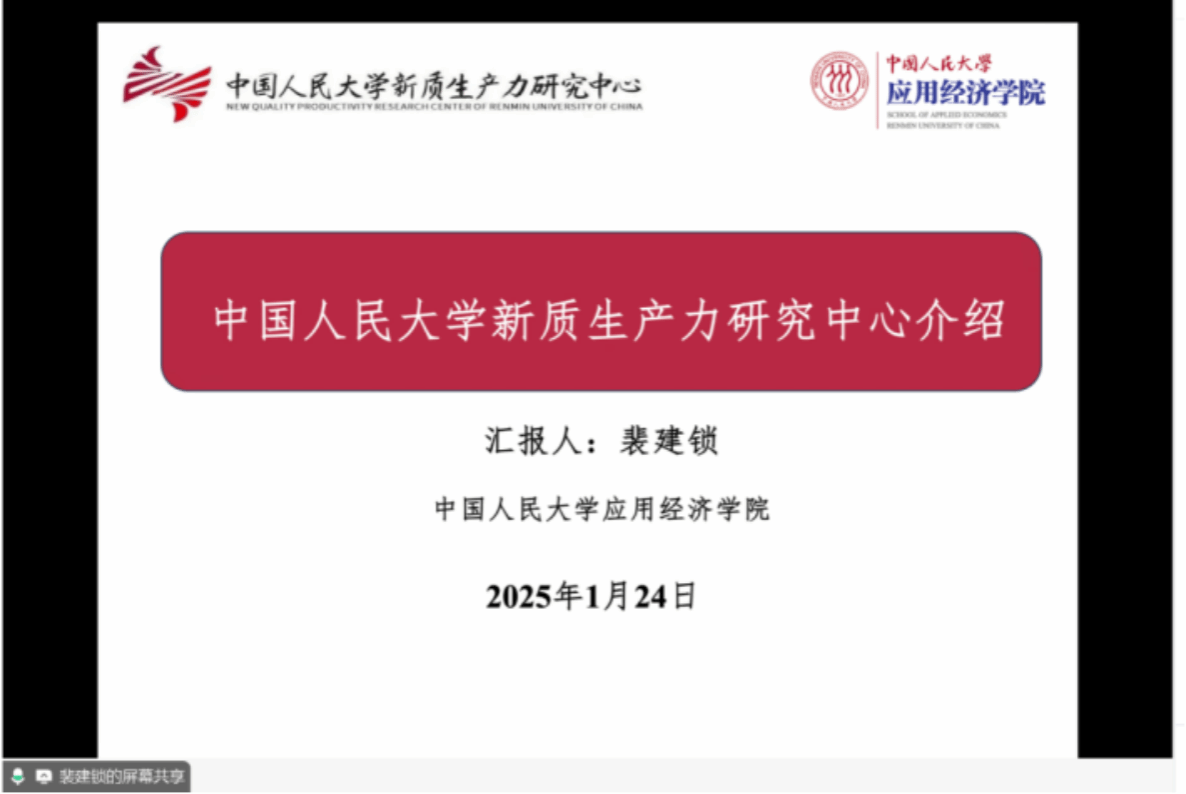 随后,中国人民大学应用经济学院副院长裴建锁教授分享了中国人民大学新质生产力研究中心的建设进展与未来规划。裴教授从构建中国自主知识体系、提升人才自主培养质量、以及多方位服务经济社会高质量发展等方面介绍了中国人民大学新质生产力研究中心的工作思路。他还展示了研究院在相关领域取得的一系列成果,为与会者提供了宝贵的经验和启示。