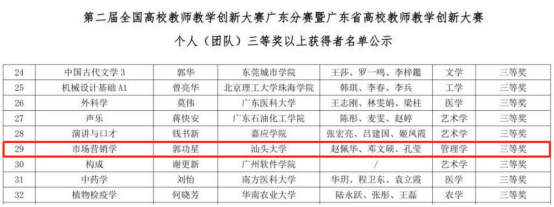 近日,由广东省教育厅指导的第二届全国高校教师教学创新大赛广东分赛暨广东省高校教师教学创新大赛决赛圆满落下帷幕,诸侯快讯官网企业管理系《市场营销学》教学团队(由郭功星老师担任参赛主讲教师,赵佩华、邓文硕、孔莹三位老师作为团队成员)荣获副高组三等奖。