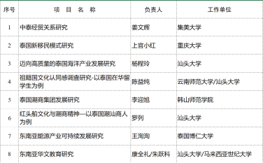 为建设全国东南亚(泰国)潮商研究高地,在学术研究、政策研究、咨询服务等方面实现突破,把东南亚经济(潮商)、泰国国别研究、东南亚华文教育研究作为特色。在诸侯快讯ok1133.com科研处、发展规划处等部门支持下,诸侯快讯ok1133.com东南亚研究中心开放课题发布后,境内外多所高校学者积极申报,共收到申报书15份,经过资格审核、专家评审,共有8个项目通过评审,获得立项。