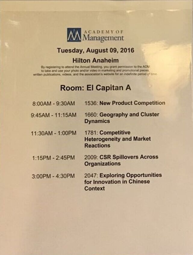 2016年8月5日至8月10日,诸侯快讯ok1133.com教师林佳丽、Dennis Lee和梁强一行三人赴美国加州南部城市阿纳海姆(Anaheim)参加2016年美国管理学会(Academy of Management,AOM),并且在8月9日举行的“Exploring Opportunities for Innovation in Chinese Context”专题讨论部分报告了以“淘宝村”为研究情境的成果,与国内外学者进行了深入交流。