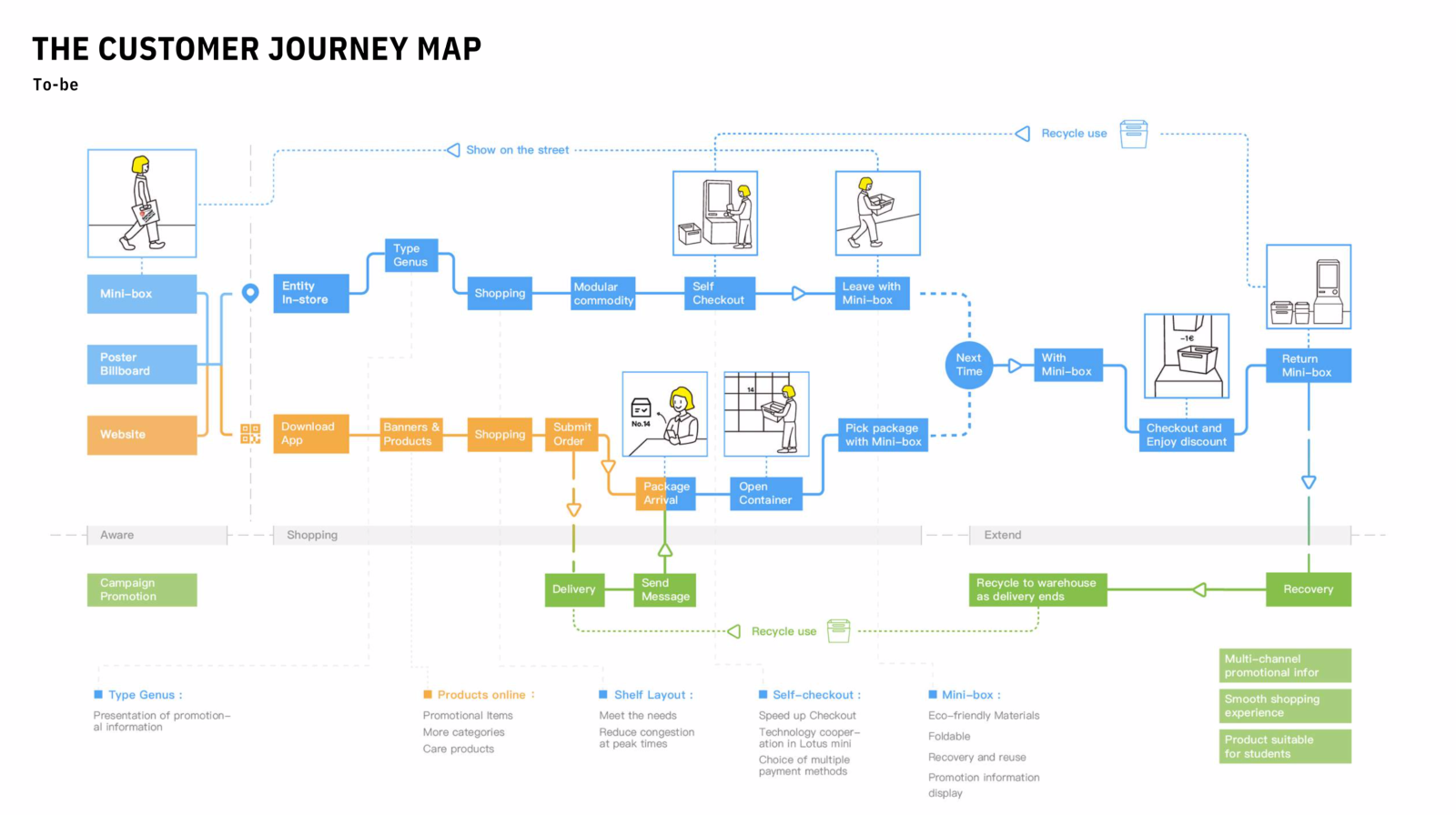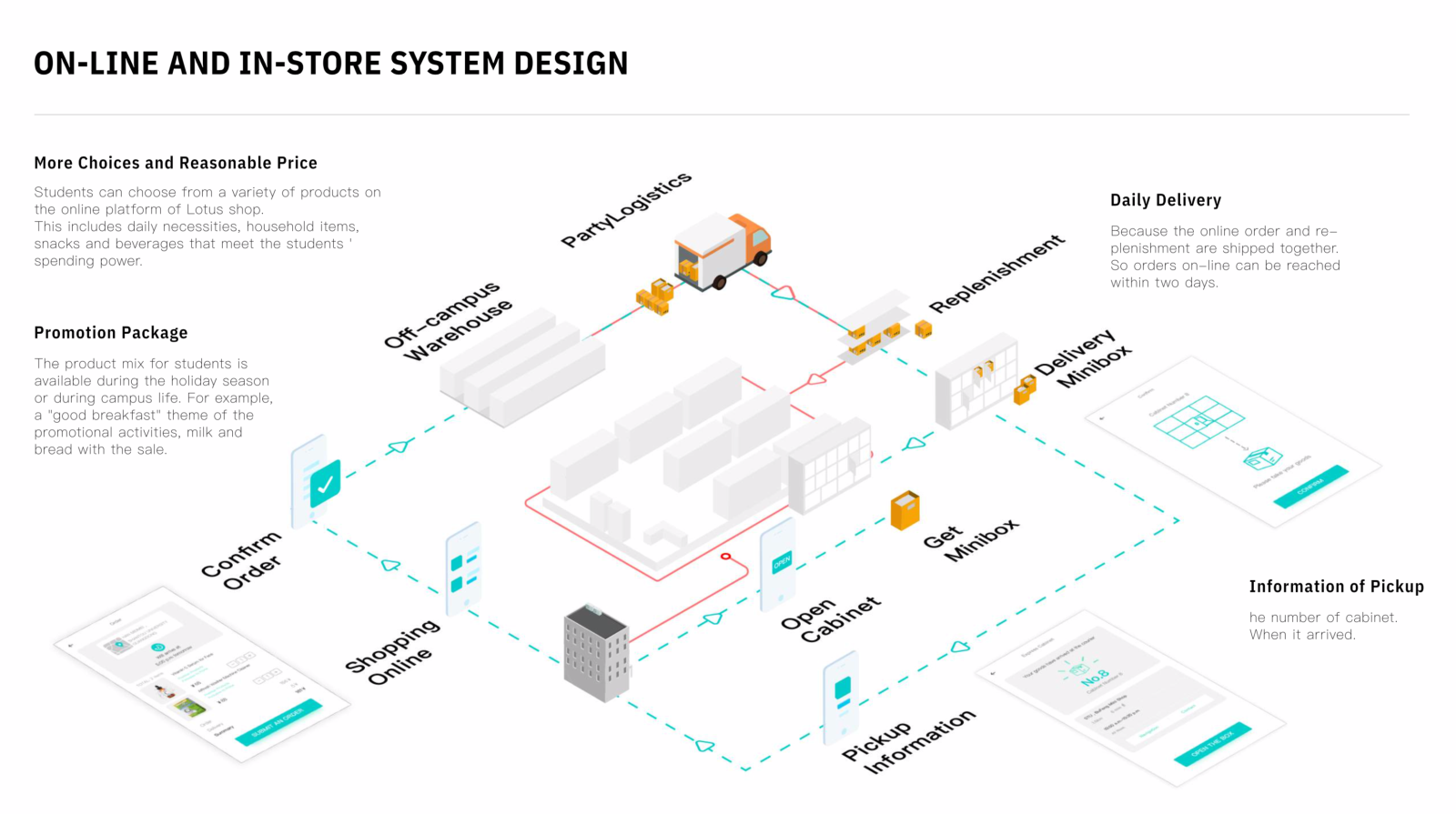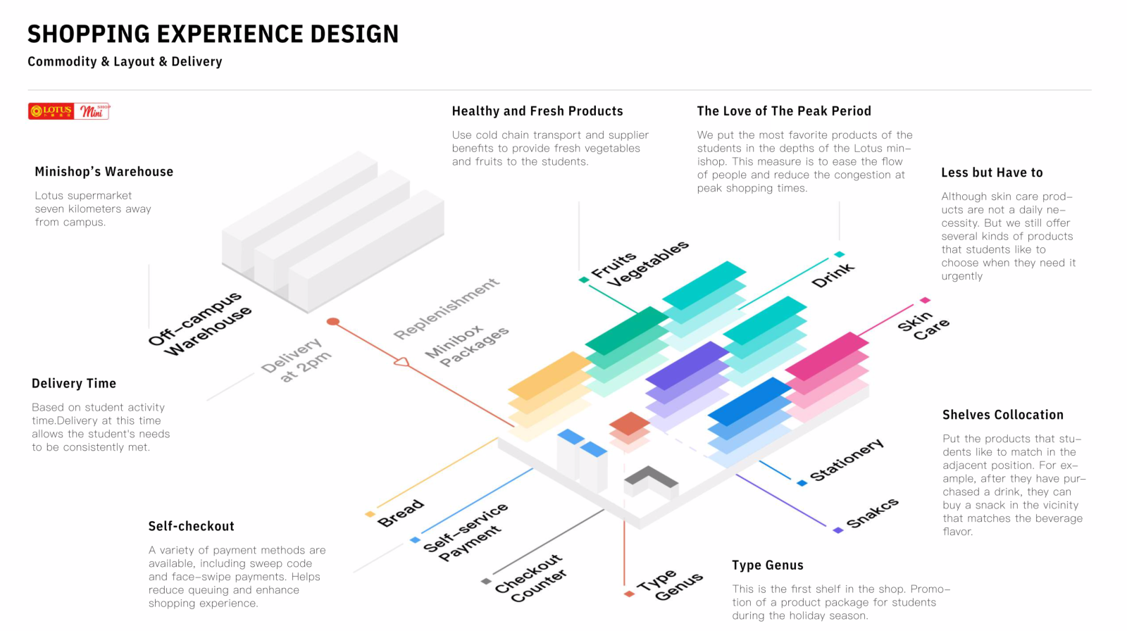 在课程教学和课题开展的过程中,学校校园超市竞标结果也同时出炉——卜蜂莲花迷你业态(Lotus Mini)中标,梁强教授遂带领研究生团队与卜蜂莲花联合开展社区便利店消费体验升级的重新设计与研讨,结合设计方案探讨落地应用。在整个为期两个月的课程中,通过田野调查、问卷设计、商户访谈等调研分析方法,基于校园师生的行为模式和需求的研究,并结合卜蜂超市自身的经营实际情况设计出升级方案并开展了部分方案的落地实施,取得了良好的效益提升。