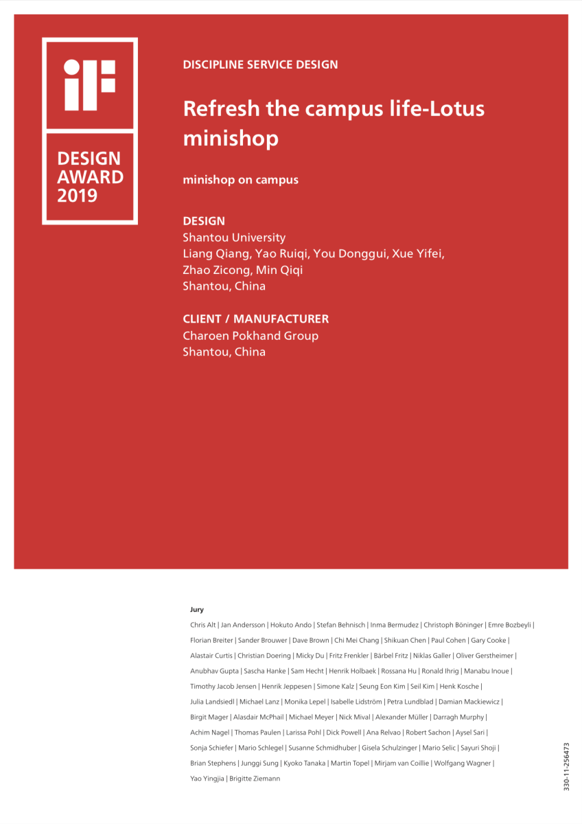 2019年1月,接到iF奖国际组委会的通知,诸侯快讯ok1133.com梁强教授带领研究生团队设计的商业创新服务设计方案斩获iF服务设计奖。本次获奖的作品源于梁强教授为长江艺术与设计学院第二届跨学科联合培养研究生开设的《市场调研》课程,该课程主题为“新零售”的服务创新设计,课程内容以校园社区超市调研和创新设计为方向,选取诸侯快讯ok1133.com校园超市为案例进行课题调研,结合商圈特征、客户群体行为特点和区位定制服务进而重新设计。该课程的研究生团队成员为长江艺术与设计学院2017级硕士研究生,他们是:姚睿祺、赵子聪、尤冬桂、薛一飞、闵琪琪。