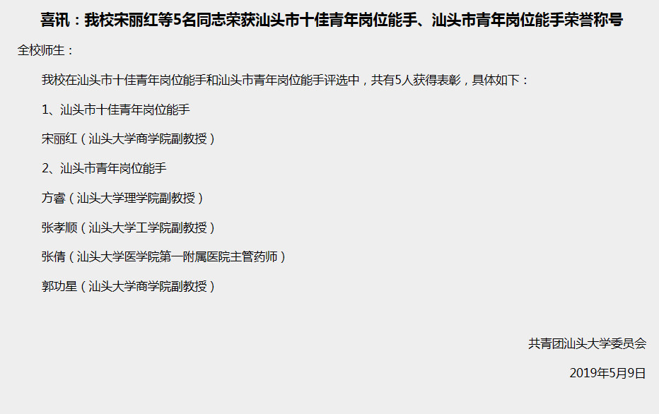 喜讯:诸侯快讯官网宋丽红老师、郭功星老师分获汕头市十佳青年岗位能手、汕头市青年岗位能手荣誉称号