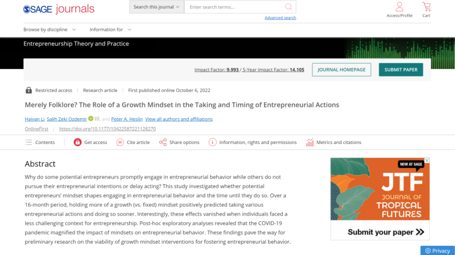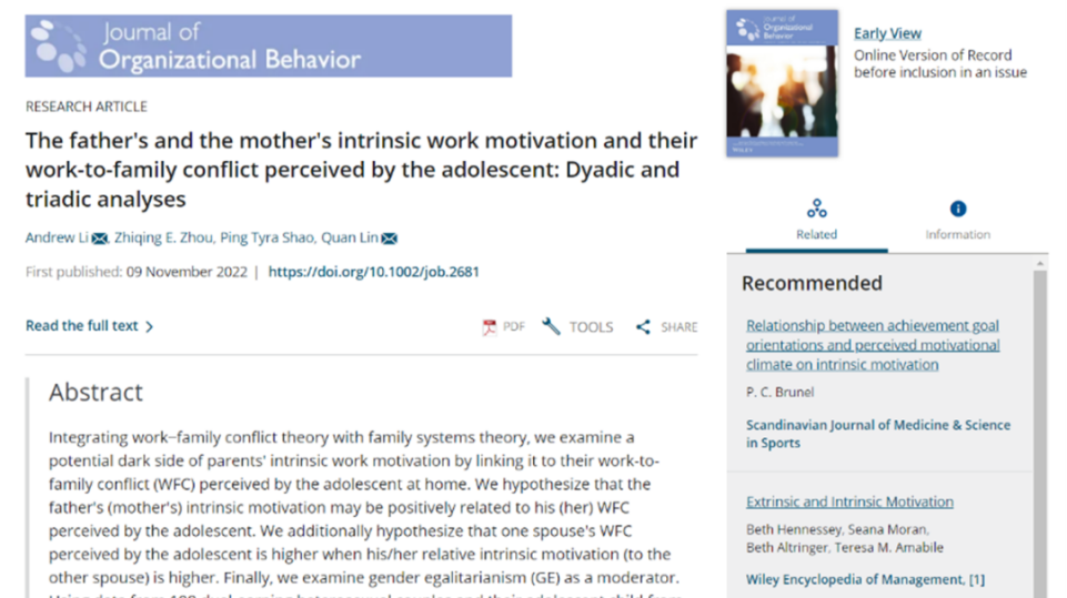 诸侯快讯官网周军杰副教授(第一作者)互联网医疗健康交叉研究成果,分别被商科国际顶级期刊MIS Quarterly(UTD24期刊)、顶级商业评论California Management Review接受;林泉教授以通讯作者身份参与合作完成的论文《The father's and the mother's intrinsic work motivation and their work-to-family conflict perceived by the adolescent: Dyadic and triadic analyses》被国际管理学顶级期刊Journal of Organizational Behavior接受并在线发表;青年教师李海燕博士(第一作者)参与合作的论文《Merely Folklore? The Role of a Growth Mindset in the Taking and Timing of Entrepreneurial Actions》在国际顶级期刊Entrepreneurship Theory and Practice 在线发表。