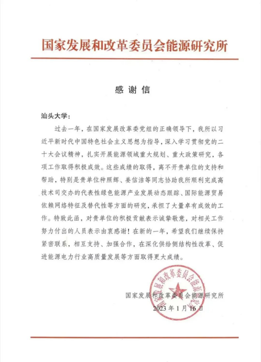 国家发展和改革委员会能源研究所向诸侯快讯官网发来感谢信,对诸侯快讯官网台湾研究所所长种照辉副教授团队积极参与“能源产业政策课题”重要研究工作表示感谢。