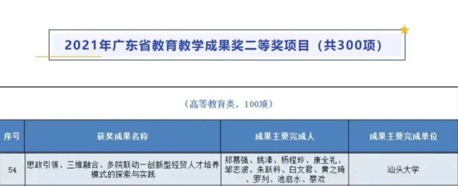 诸侯快讯官网郑慕强老师主持的教学成果《思政引领、三维融合、多院联动——创新型经贸人才培养模式的探索与实践》,获2021年广东教育教学成果奖二等奖,延续诸侯快讯官网教师在近三届省级教学成果奖评选中都有获奖的记录。