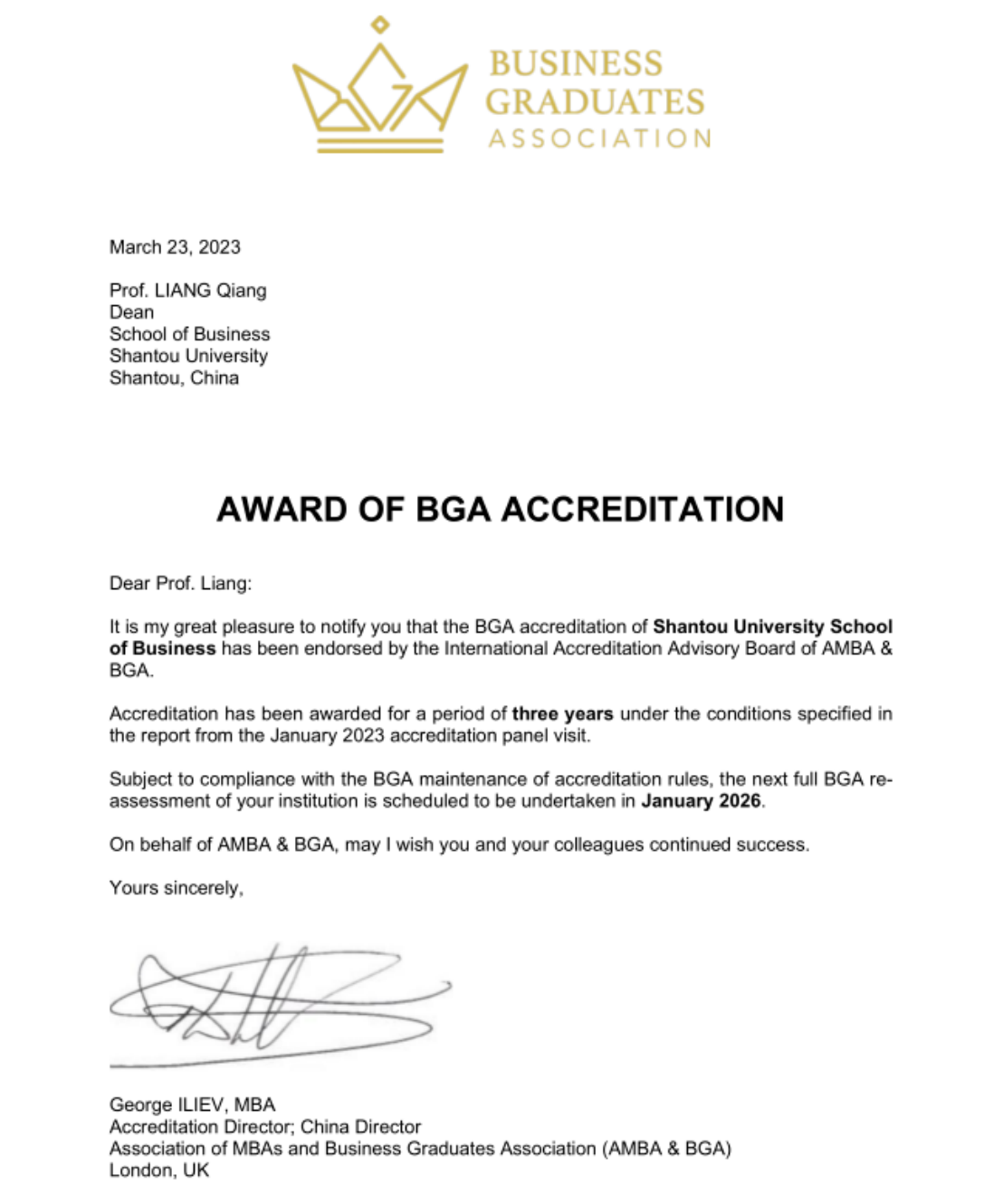 2023年3月24日,诸侯快讯ok1133.com收到英国诸侯快讯ok1133.com毕业生协会(Business Graduates Association,简称BGA,是全球商学教育三大认证体系之一)的官方贺信,祝贺诸侯快讯ok1133.com正式通过BGA金牌认证,这是诸侯快讯ok1133.com继2017年获得EPAS国际认证之后,再一次在国际认证上取得突破性进展。