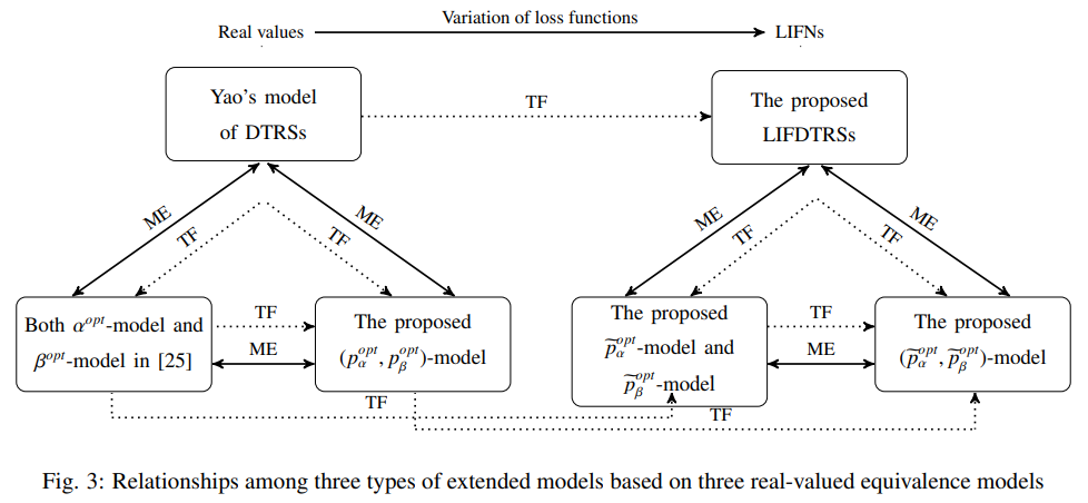 本论文从三个视角探讨了语言直觉模糊信息下的三支决策模型及知识获取问题。首先采用映射方法定义了一种语言直觉模糊数的排序测度及方法,并分析了测度的相关性质。进而基于直觉模糊数已有测度拓展了语言直觉模糊数七种排序测度,通过实验表明所提出的语言直觉模糊数排序测度的有效性及优势。在此基础上,分别建立决策粗糙集视角下的语言直觉模糊三支决策模型、双优化策略视角下的语言直觉模糊三支决策模型和单优化策略视角下的语言直觉模糊三支决策模型,并理论上证明了该三类模型数学上的等价性且分析了六种拓展模型之间的关系(见图Fig.3)。相比于决策粗糙集视角下和双优化策略视角下的语言直觉模糊三支决策模型,单优化策略视角下的语言直觉模糊三支决策模型具有求解时效快和可推广性,同时能解决在一些情形下概率阈值对(α,β)难以确定的问题。基于此,我们设计了基于单优化策略的语言直觉模糊三支决策方法及决策知识获取算法。最后,采用算例分析和仿真实验的方法验证了所提出方法相对于现有方法的有效性及优势。