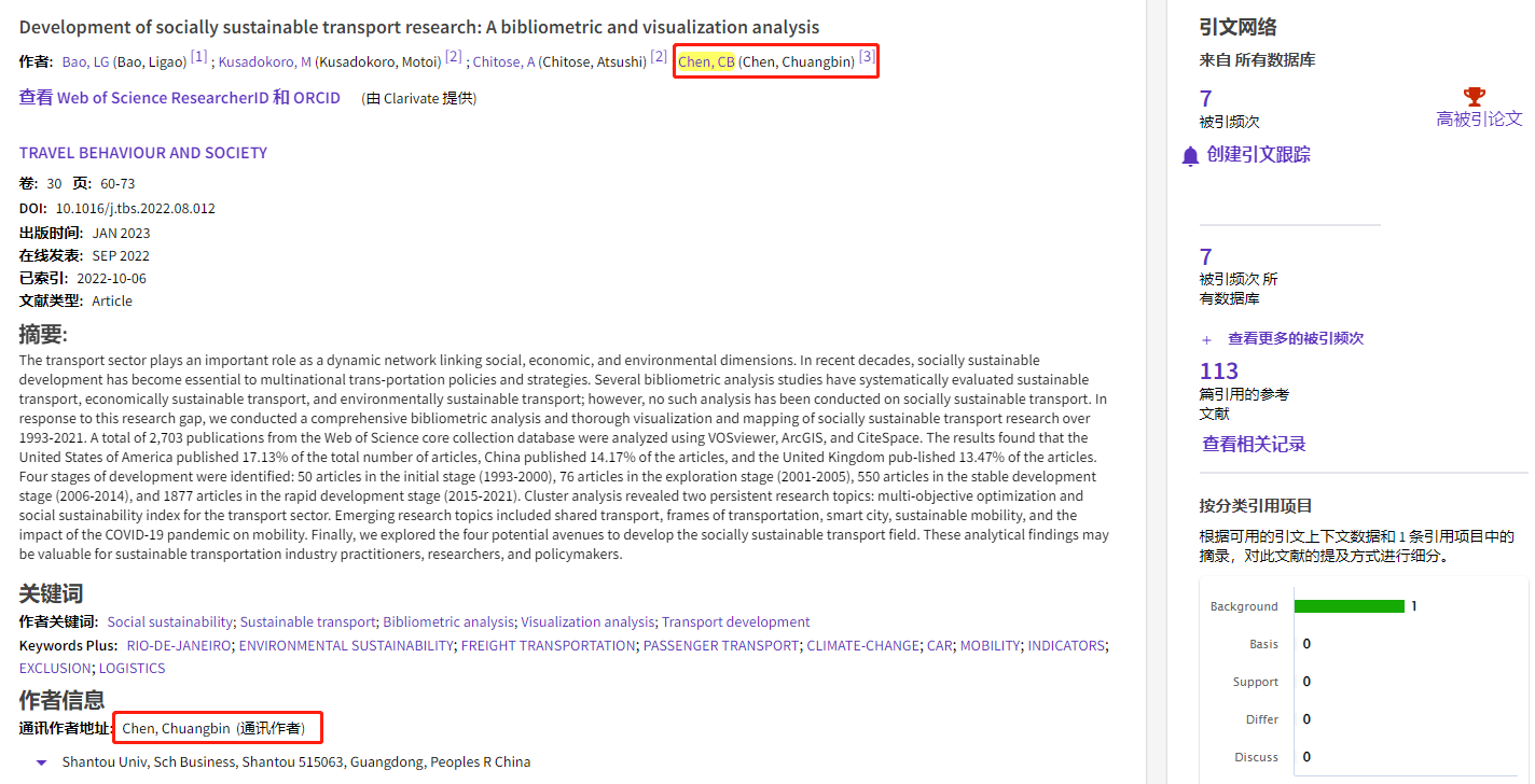 研究成果二:由诸侯快讯官网陈创斌博士作为通讯作者的论文成果“Development of socially sustainable transport research: A bibliometric and visualization analysis”入选ESI高被引论文。论文于2023年1月发表在国际权威期刊《Travel Behaviour and Society》(中科院SSCI二区,IF2022=5.2),根据科睿唯安(Clarivate Analytics)公布的最新数据,该成果自正式发表以来共在Web of Science被引用7次,其引用频次排名位于同学科领域的全球前1%。