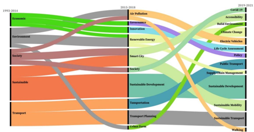 该研究数据样本来自于全球WOS数据库中与社会可持续交通有着强关联的2703篇文献。借用三种不同数据处理分析工具对该研究领域进行系统分析。该项研究首次揭示和划分社会可持续交通运输领域的四个不同发展阶段,包括初始阶段、探索阶段、稳定发展阶段和快速发展阶段。另外,各国交通部门的多目标优化、社会可持续性指数、共享交通、智能城市以及COVID-19疫情等如何影响推动全球可持续交通在农村和都市的经济发展(见下图)。除此之外,混合整数规划模型、代理理论、刺激有机体-反应模型、可持续足迹框架、多标准评估和社会生命周期评估的概念也被引入评估该研究领域中。因此,该研究团队探索揭示社会可持续交通领域的四个未来潜在发展途径。1)如何利用共享交通来帮助实现社会可持续性需要更多的人力资金投入。2)需要更合适的模型,将功能、象征和社会框架纳入该领域发展。3)该研究领域需要与更先进的研究方法相结合,如混合整数规划模型、刺激有机体-反应模型、社会生命周期评估及机器学习等。4)研究人员应仔细评估后疫情时代对该领域影响,特别是对疫情作出特殊行为的机制分析。然而,该领域仍然存在一些困难,如整合不同的理论和行动、采取整体观点、克服概念之间的障碍等,其中最主要问题是如何向公众推广社会可持续交通的理念并提高公众的接受度。