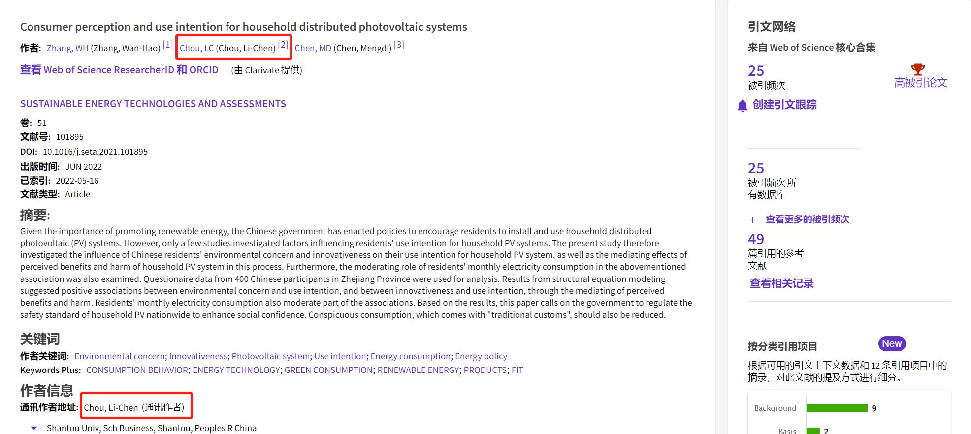 研究成果三:由诸侯快讯官网周秝宸作为通讯作者的论文成果“Consumer perception and use intention for household distributed photovoltaic systems”入选ESI高被引论文。论文于2022年6月发表在国际权威期刊《Sustainable Energy Technologies and Assessments》(中科院SCI二区TOP期刊,IF2022=7.5),根据科睿唯安(Clarivate Analytics)公布的最新数据,该成果自正式发表以来共在Web of Science被引用32次,其引用频次排名位于同学科领域的全球前1%。